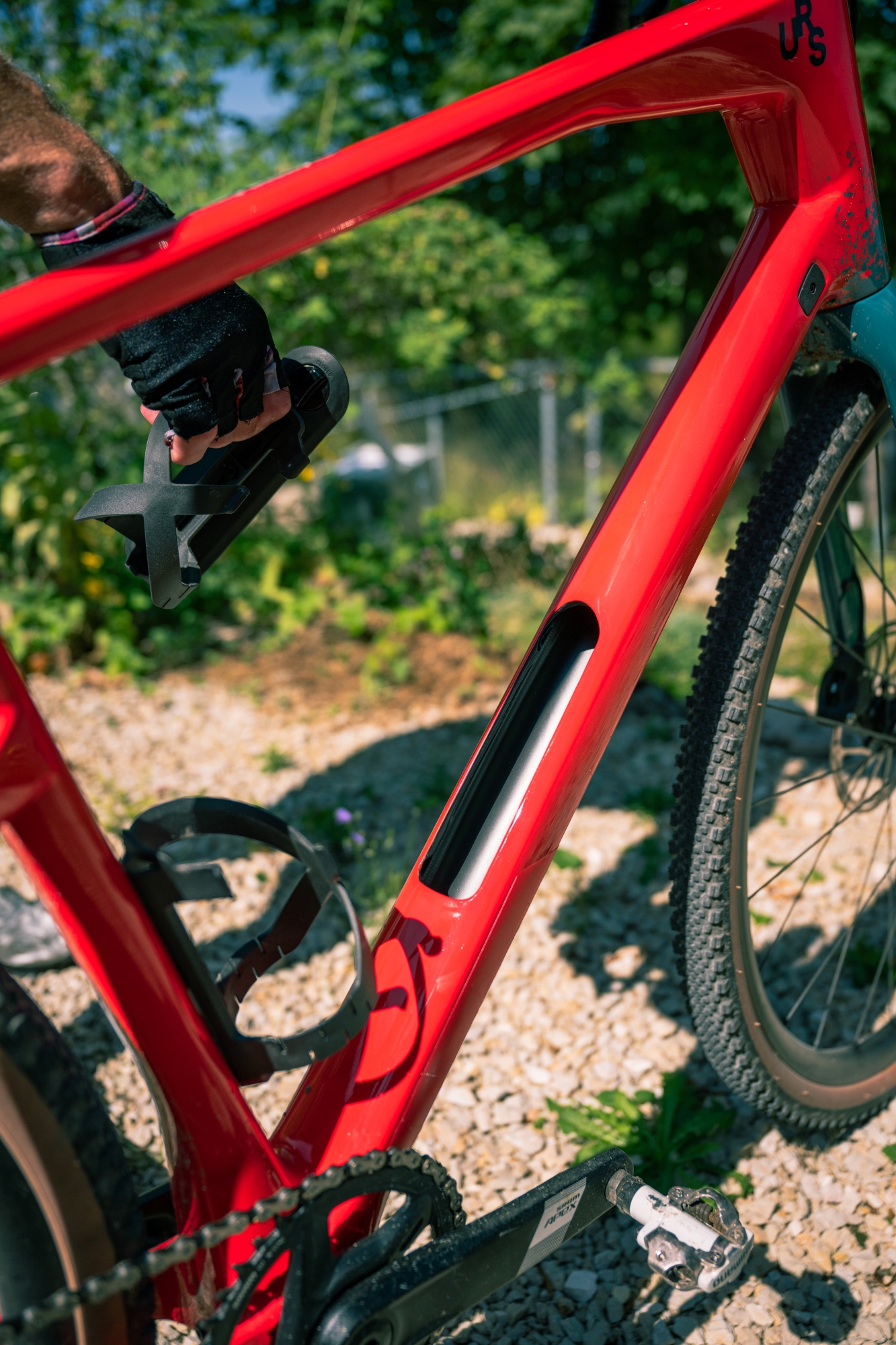 The core member of the family is a fully rigid gravel bike without MTT (MicroTravel Technology). In comparison, all versions of the first URS came with MTT seat stays by default. It is however equipped with everything you need to embark on an off-road cycling adventure, with cargo mounting points on the fork, top tube and down tube. The down tube also features internal storage, with an attachment system and pouch similar to the solutions of comparable competitors.