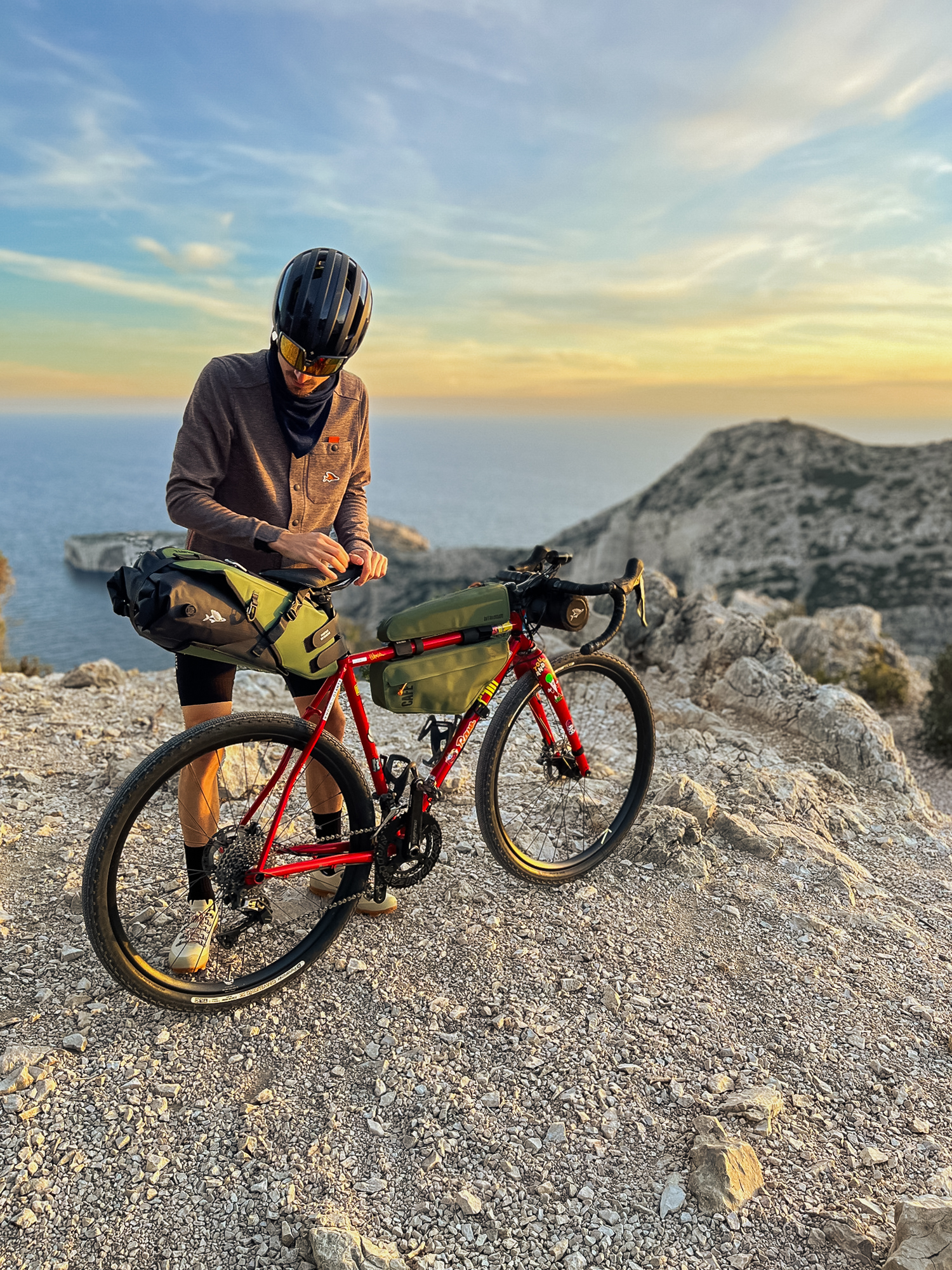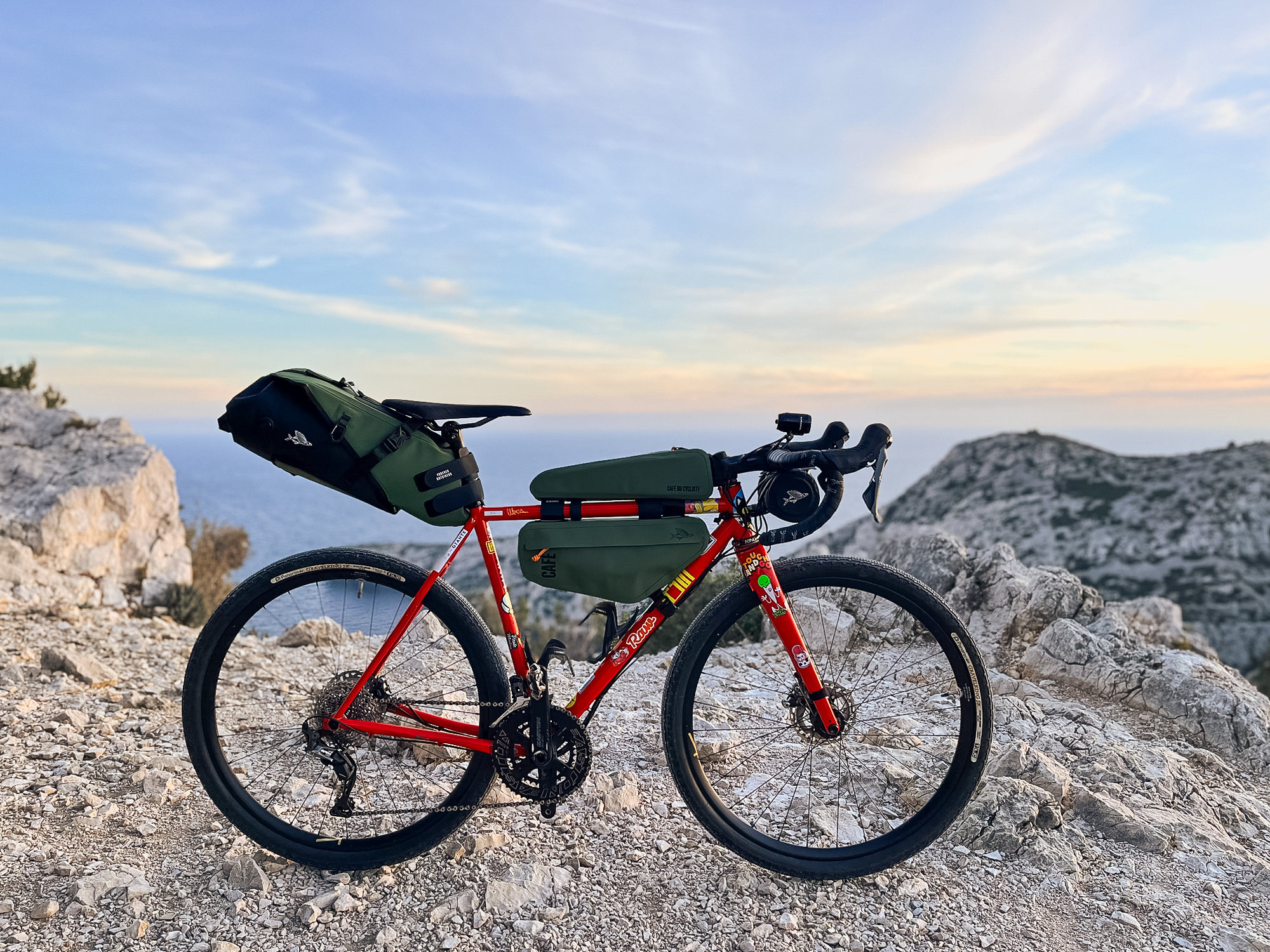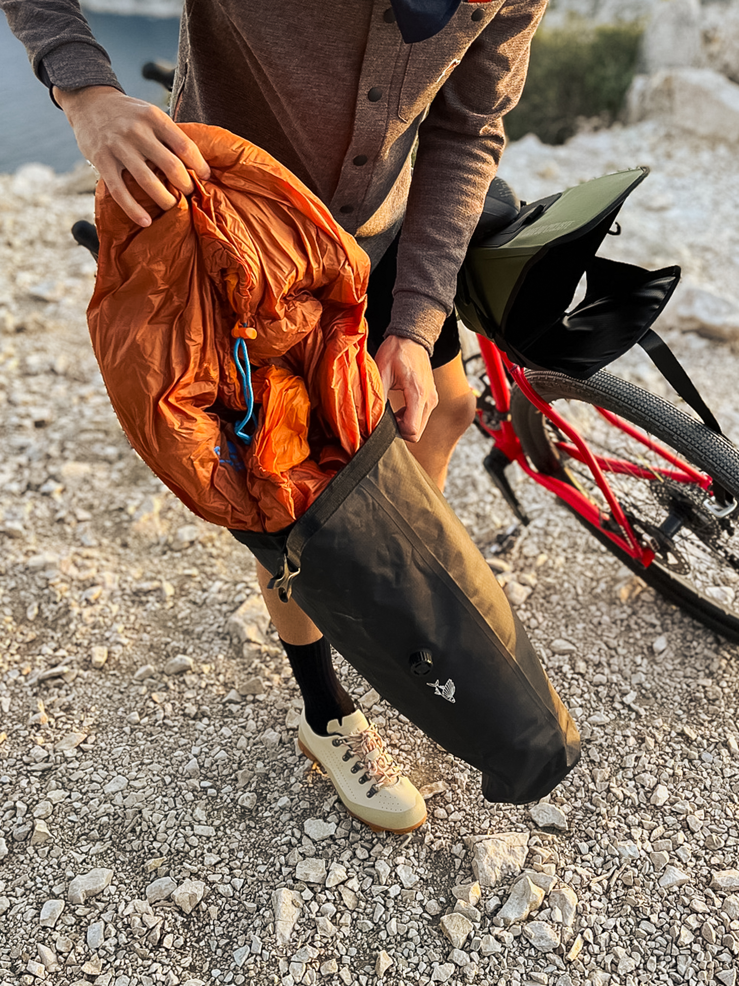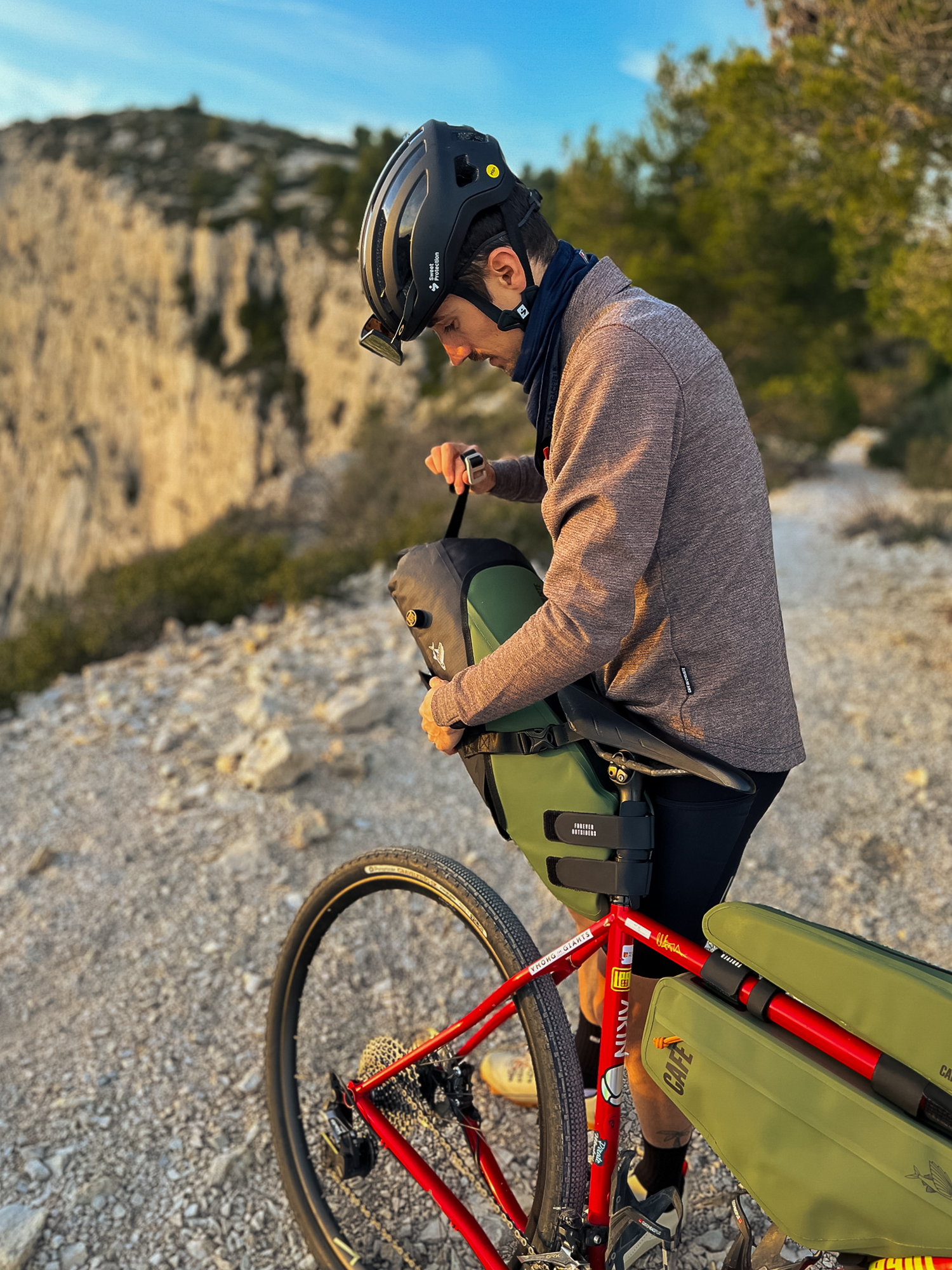 Olive green is the first thing you will notice about this complete set of bikepacking bags. The color is totally in line with the Côte d’Azur Mediterranean vibes, and will perfectly camouflage you in your trips. A distinctive touch is the imperceptible spark of fluorescent orange of the zips and the simple black logos all around.
