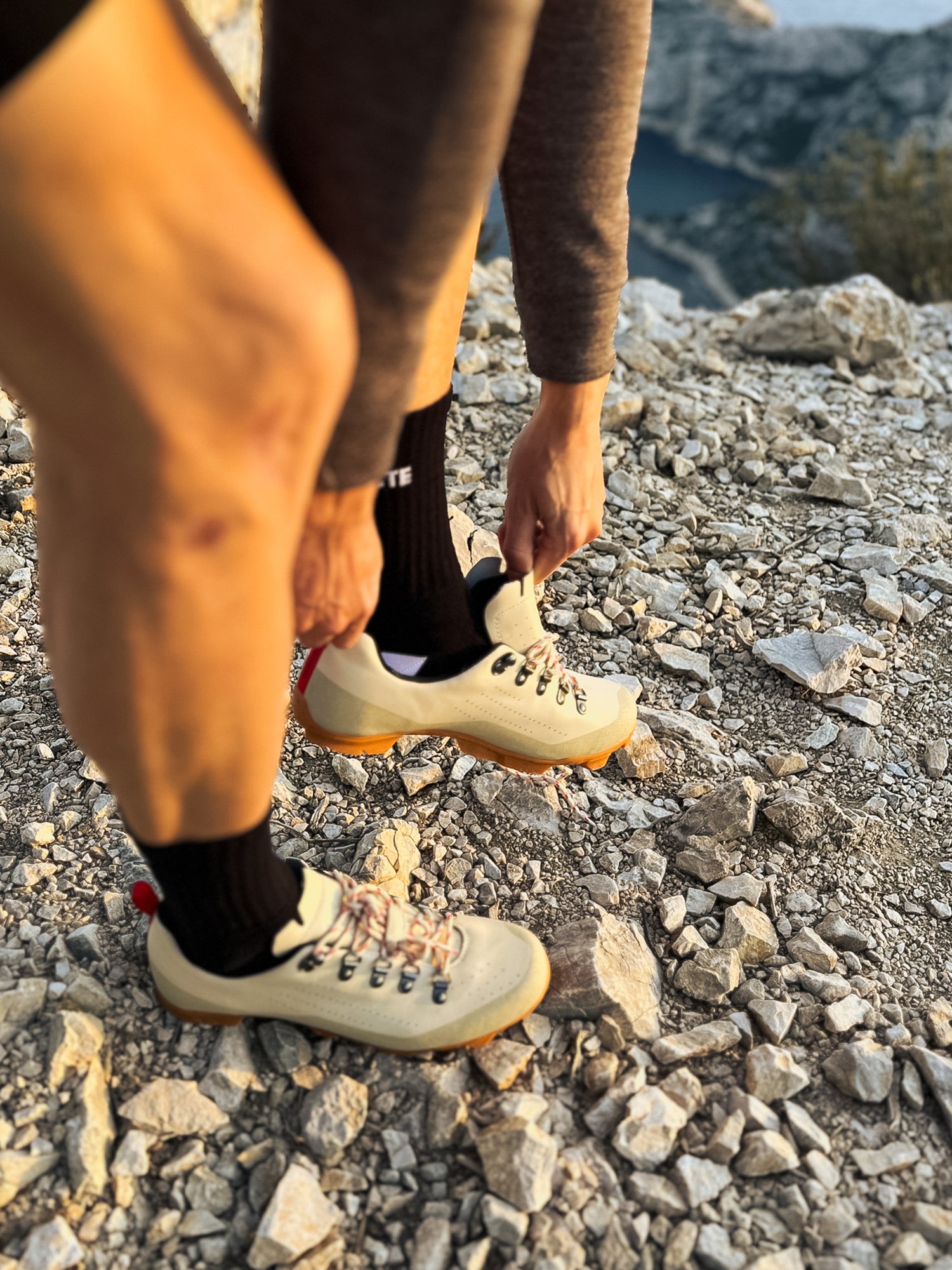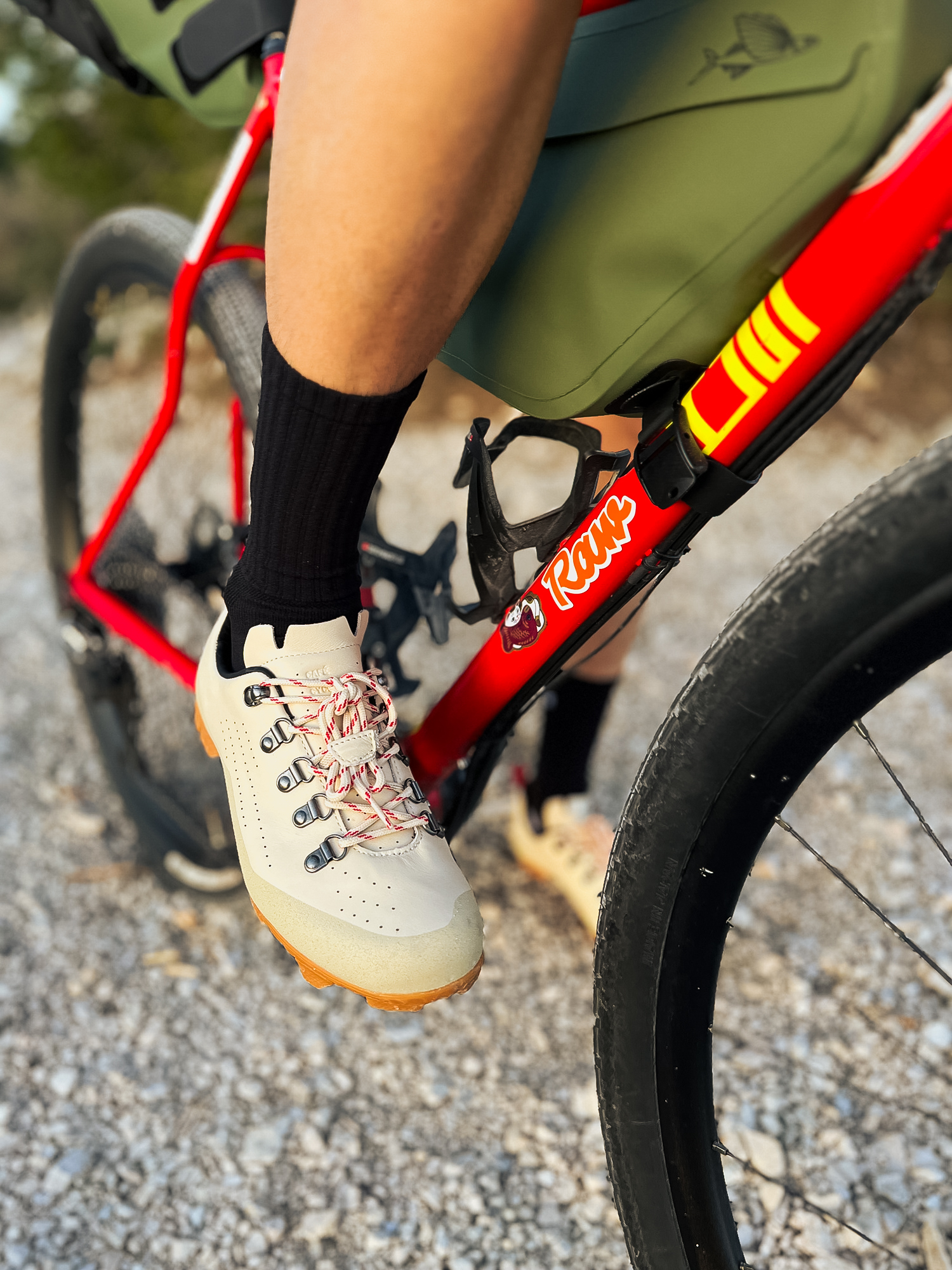 A distinctive feature of Café du Cycliste is their appreciation for aesthetics and this has been no different when conceiving their Outlands shoes. This pair of outdoor shoes, specifically designed for gravel and MTB, looks like your typical pair of mountain hiking shoes but you can fit cleats on them. They are beige, with round laces, D-ring metal eyelets, and two top hooks to tight them firmly. This gives them a carefree look but at the same time adds style to your whole outfit.