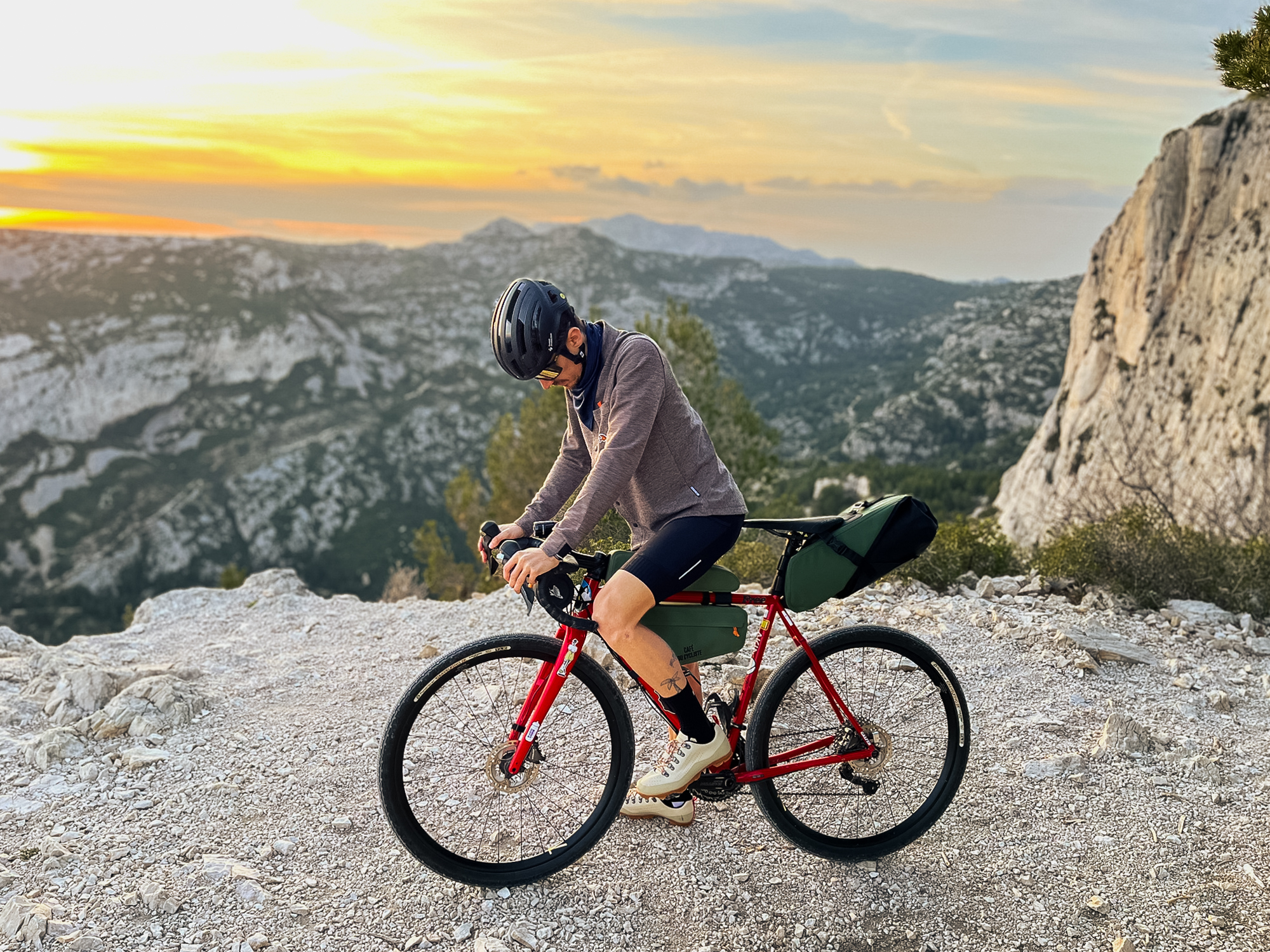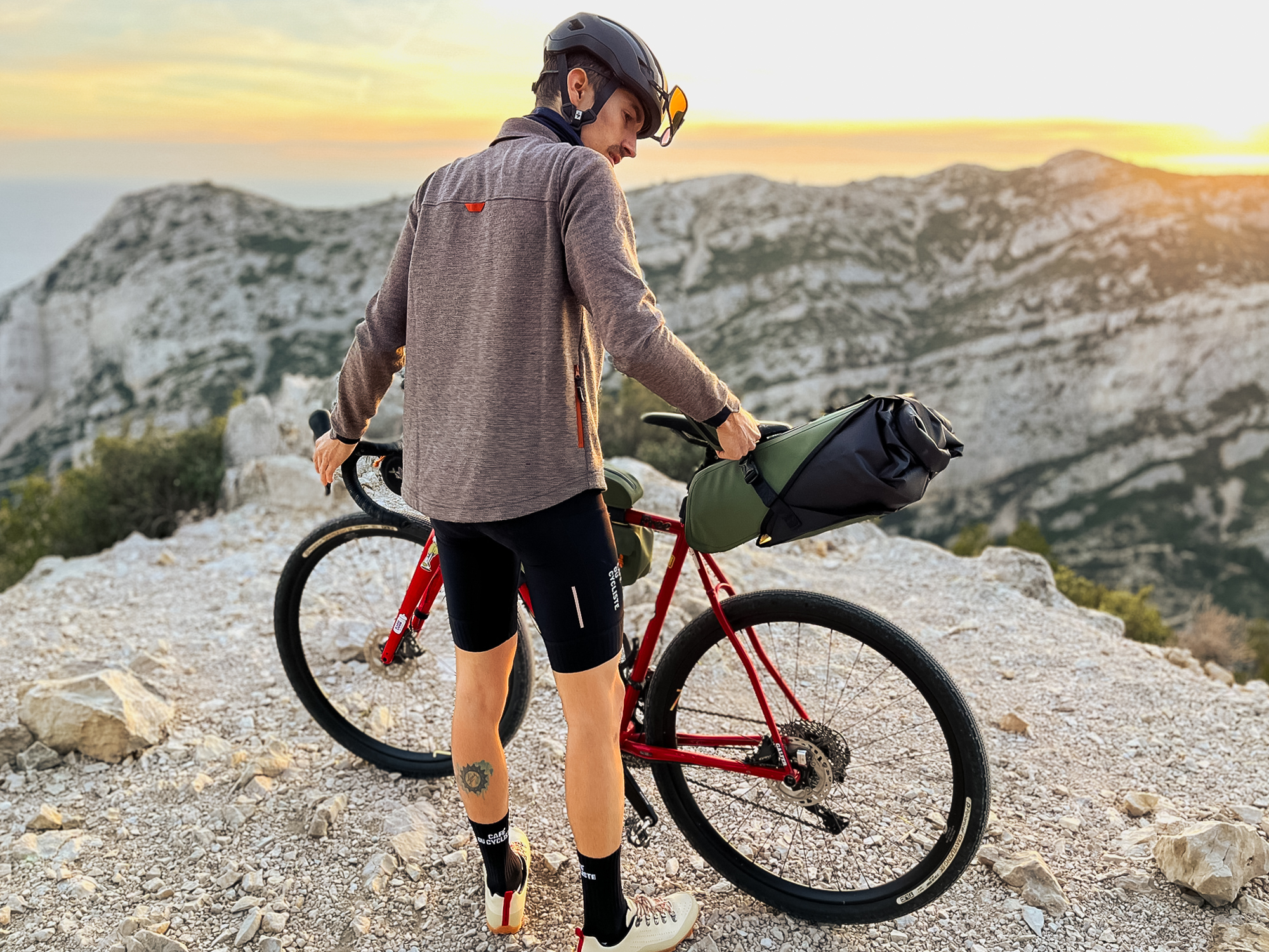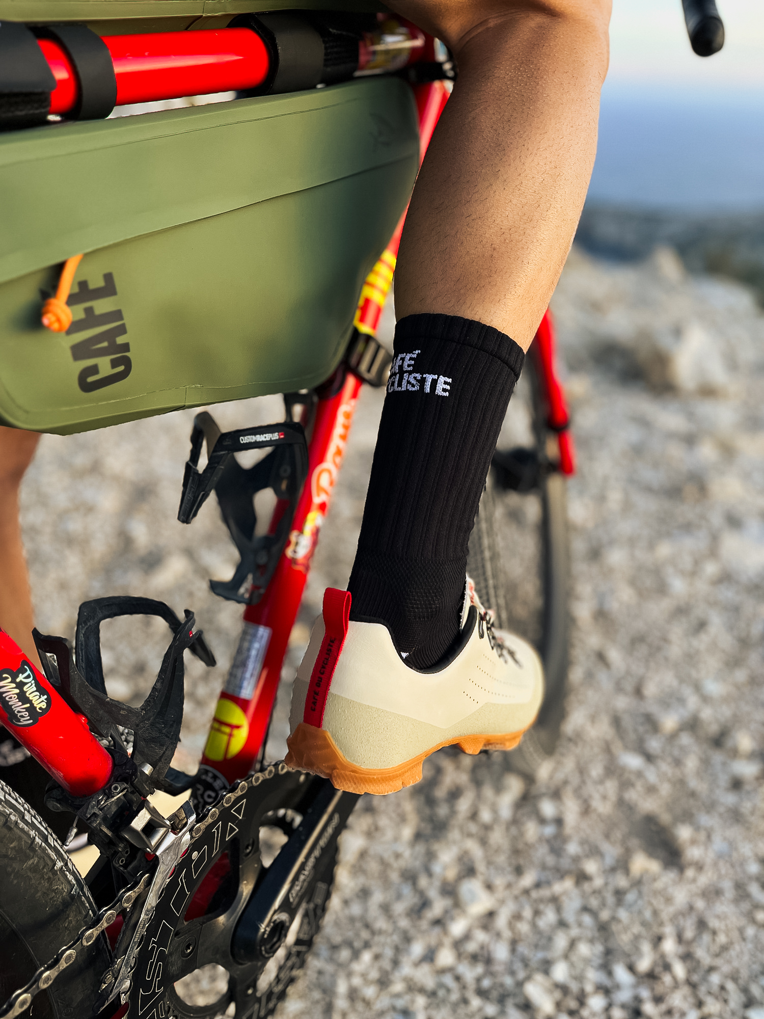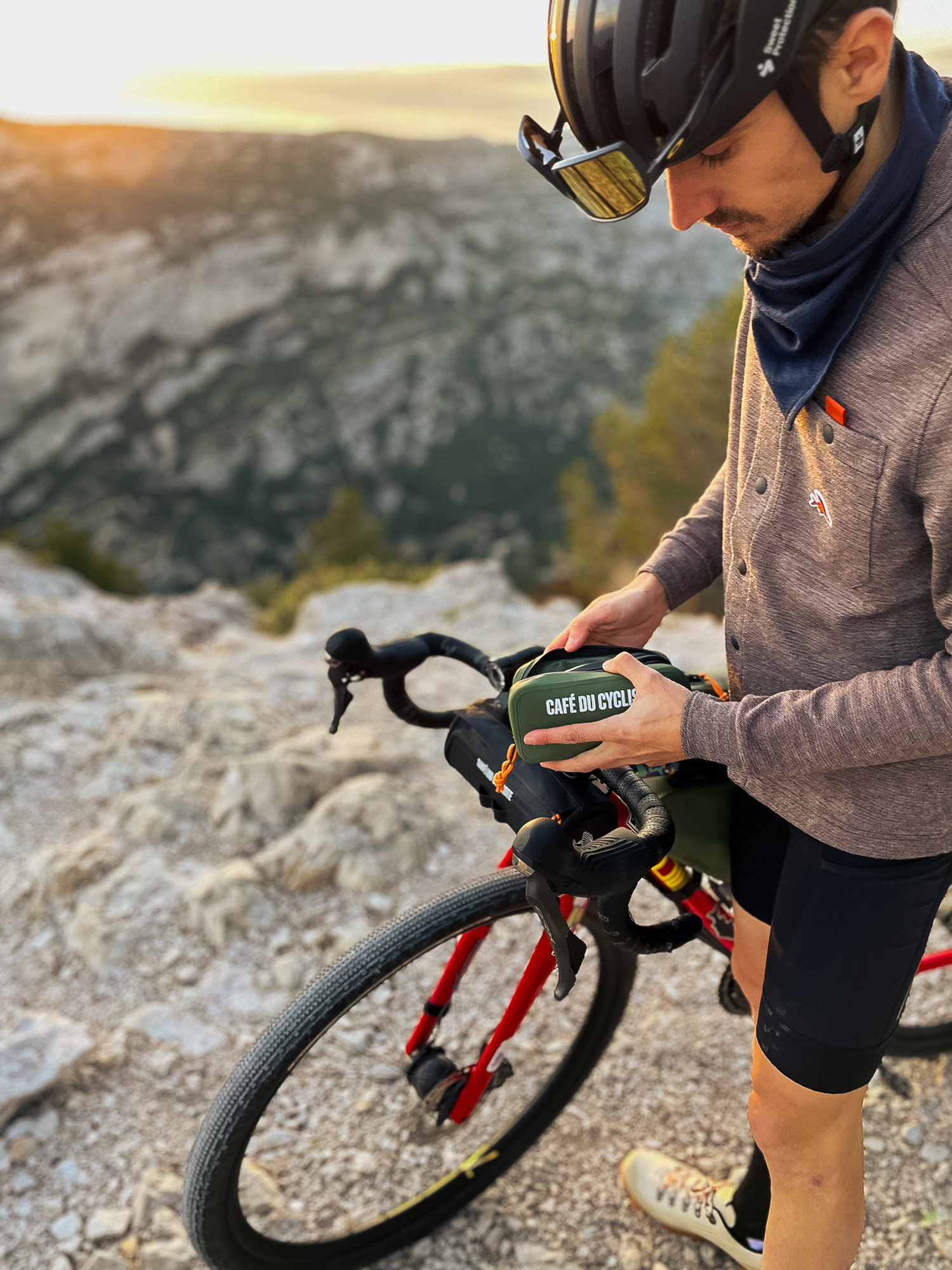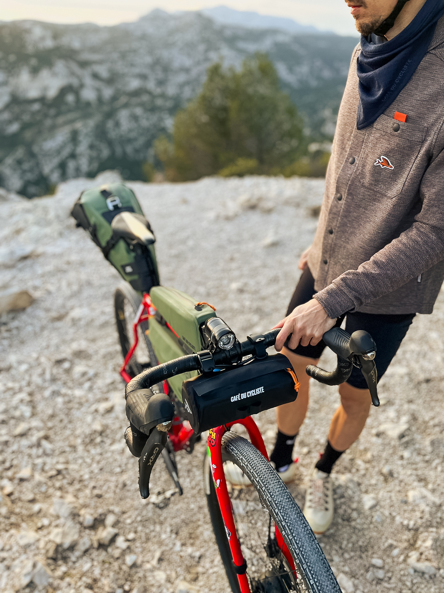 Recently, we were able to test some of their products from the Audax and Outlands collection consisting of bib shorts with side pockets, jackets for cold weather, comfy base layers, and some jerseys. All of them fitted us perfectly and adapted to the ever-changing weather conditions, with the special touch of Café du Cycliste and their unique design to stand out from the rest. Among all, we would like to highlight and look in more detail their bike bags and gravel shoes.