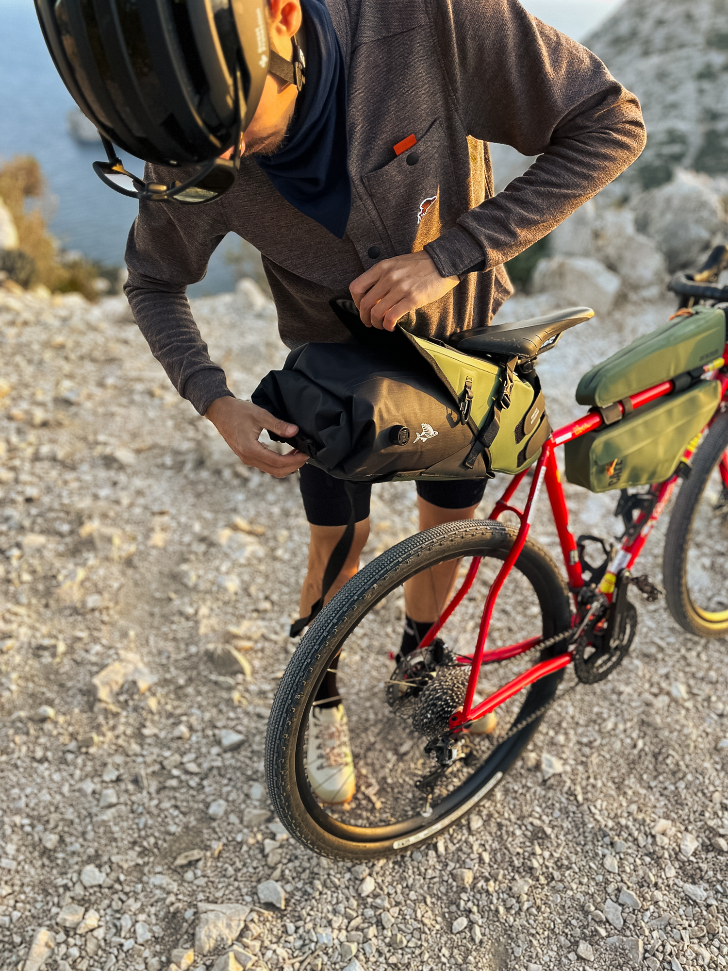 The handlebar bag is the only one in the collection that is not olive green but black, and there is probably a reason for it as you can use it without the others and it will not stand out too much. Its small size makes it a nice add-on for your bikepacking trips, but it is even nicer for one-day long rides as you can easily carry extra food. For rides like these or to further organize your gear, they have a convenient pouch small enough to put it in your jersey back pocket but big enough to fit a whole repair kit.