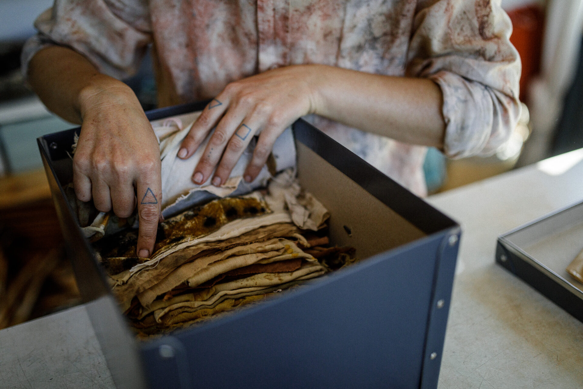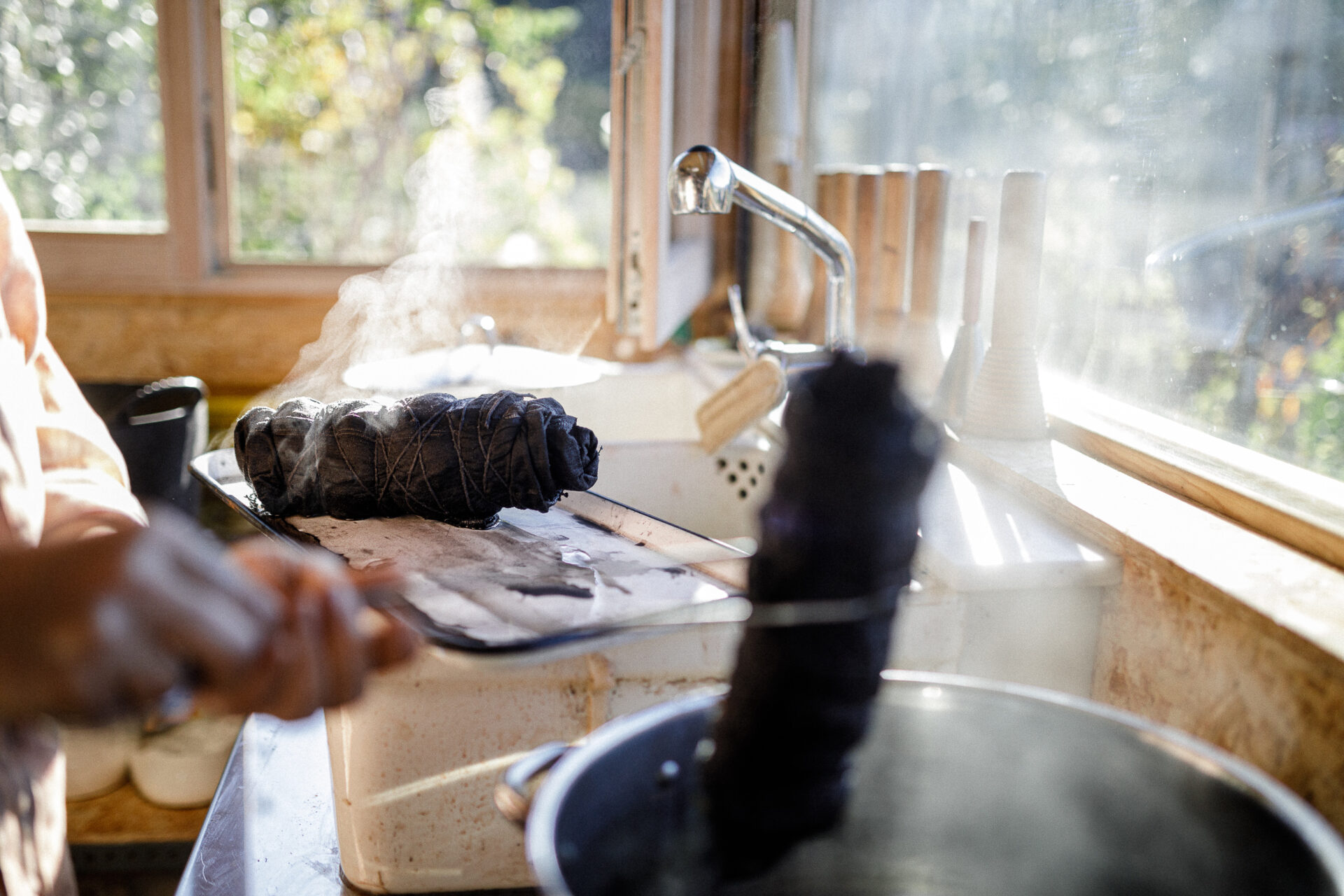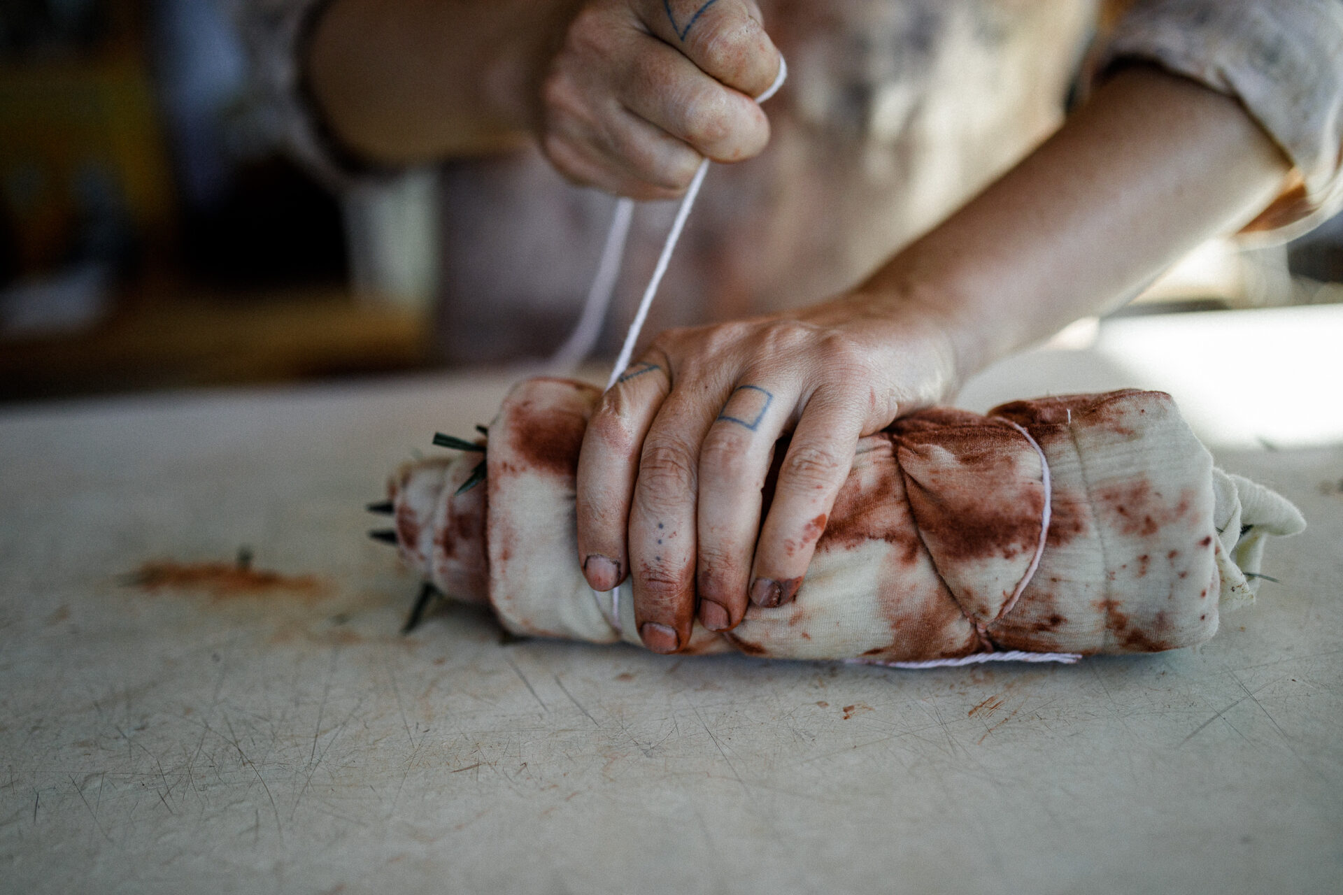 Franka opens the jersey and lays it down on the workshop table. She has several leaves and branches that she recollected earlier in the morning and precisely places them to achieve the desired eco print. The process might seem random but it is accurate and smart. The composition is finished, she makes a wrap, ties it like salami, and places it in a big pot with the dye. It looks like as we were cooking, the workshop suddenly smells sweet.