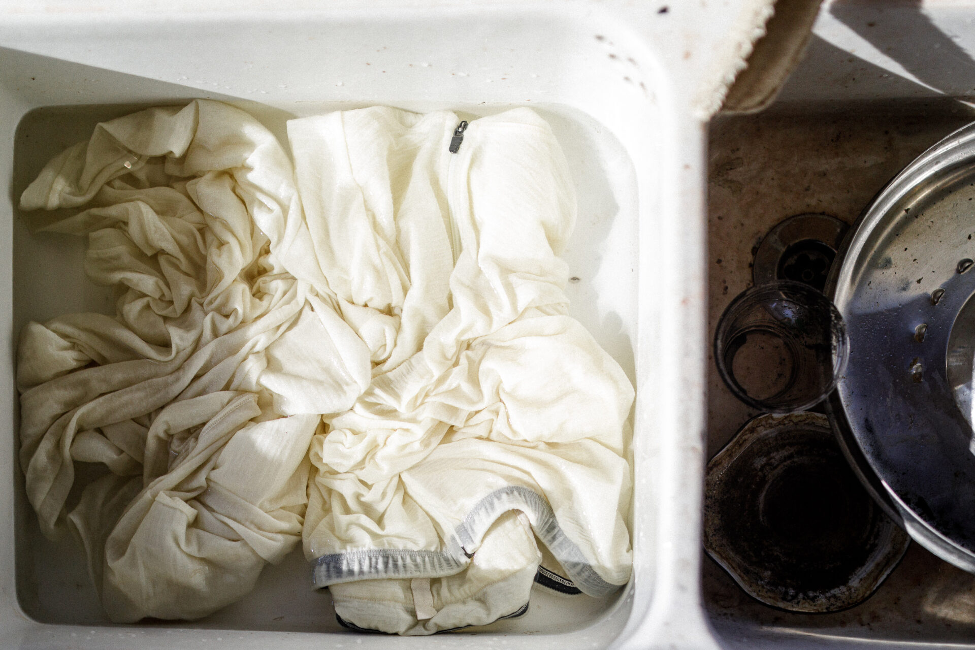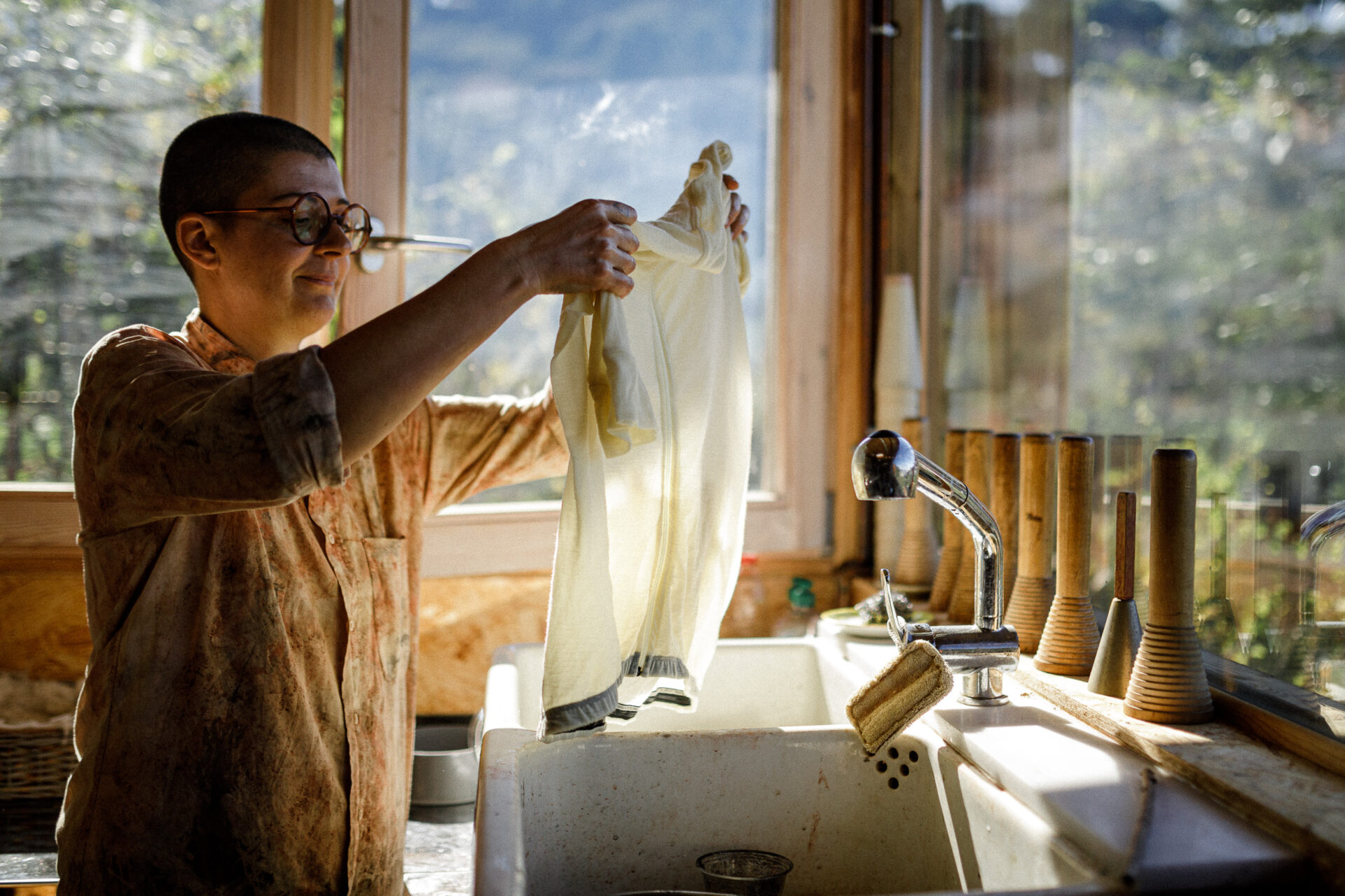Since we could see firsthand the dyeing process, we understood the subtleness of the method and Franka’s dedication to creating every single piece. Everything starts in a family workshop in Poblenou, where the jersey patterns are cut and later taken to Santa Coloma de Gramenet for sewing. After that, the garment is washed, dried, and from that moment on the magic starts.