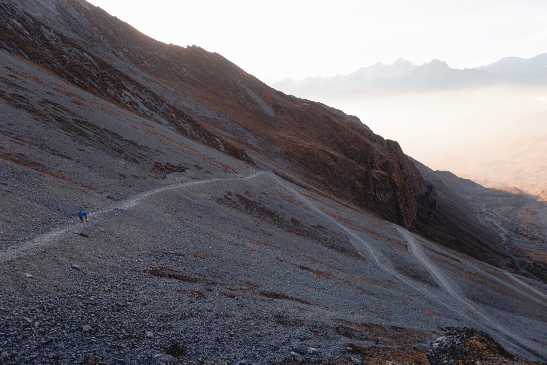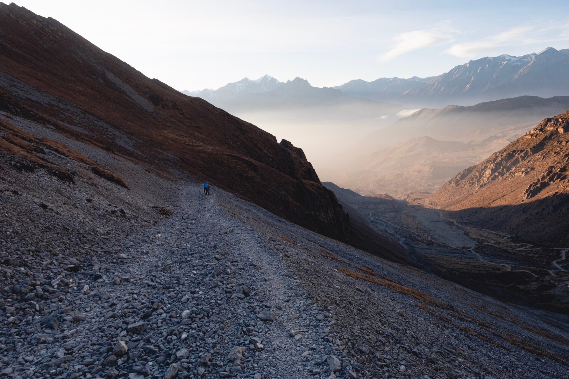 Cuando llegamos a lo alto del paso éramos los únicos allí, cosa que fue realmente especial ya que siempre hay gente tomando fotos.Desafortunadamente no pudimos estar mucho rato ya que la noche se acercaba. Para nuestra sorpresa, esperábamos poder hacer el descenso en bicicleta, pero resultó ser demasiado empinado y peligroso. Tuvimos que andar casi todos los 1.200 m de elevación hasta Chambar Bhir. El atardecer era realmente precioso, pero sabía que las temperaturas descenderían a niveles peligrosos. Debíamos movernos lo más rápido posible sin hacernos daño en la escarpada senda.