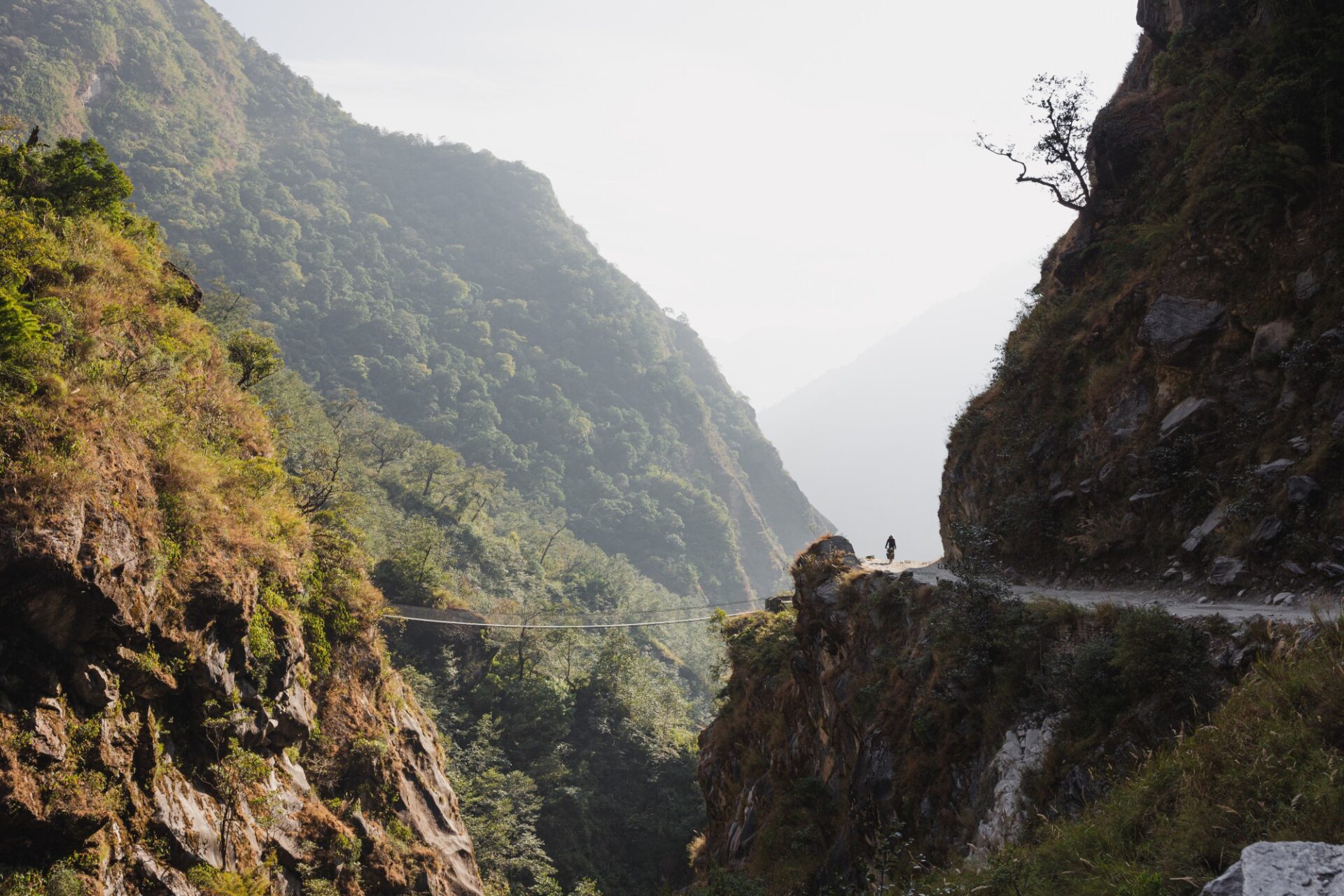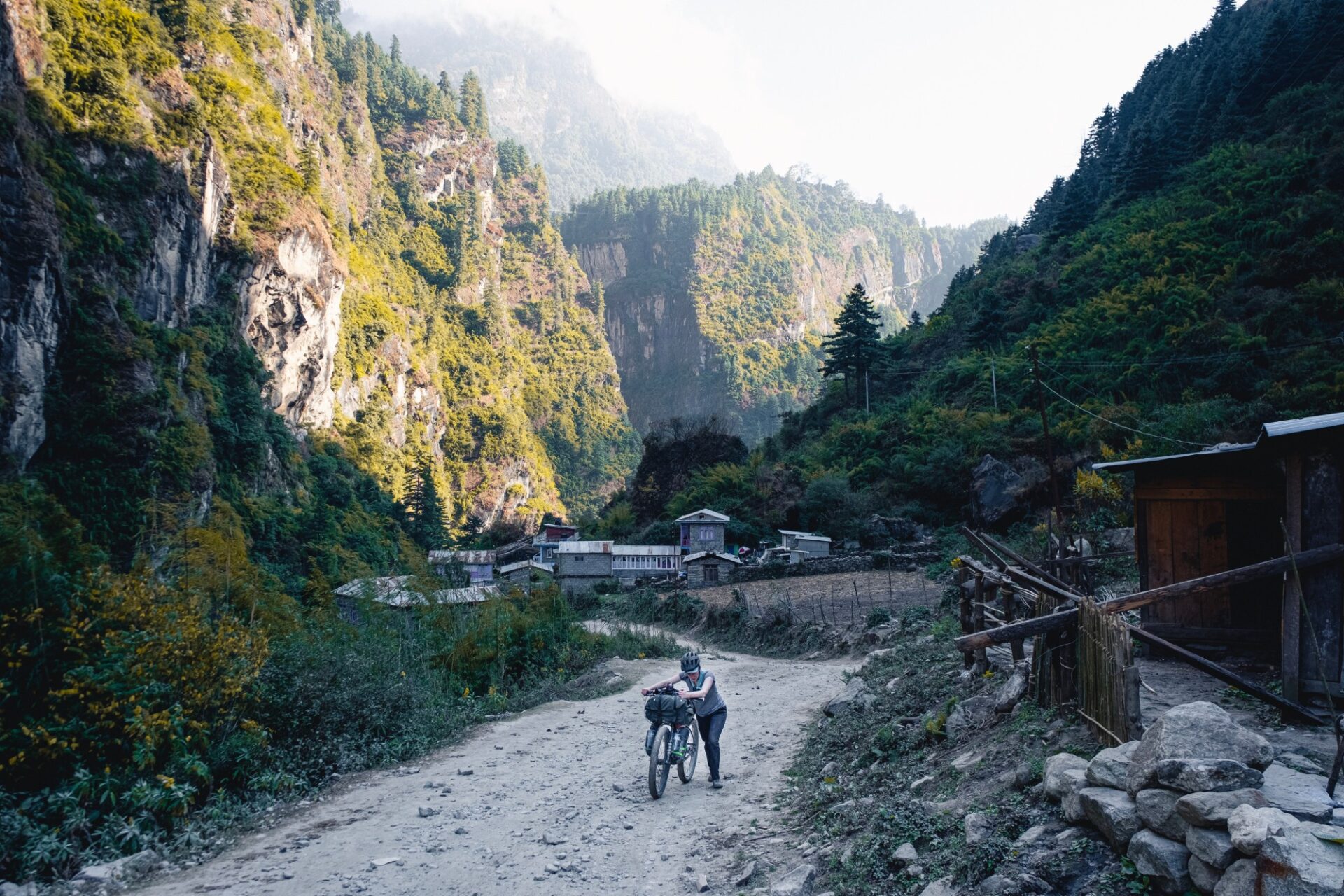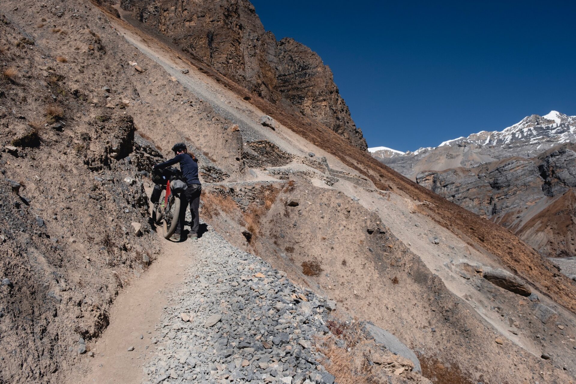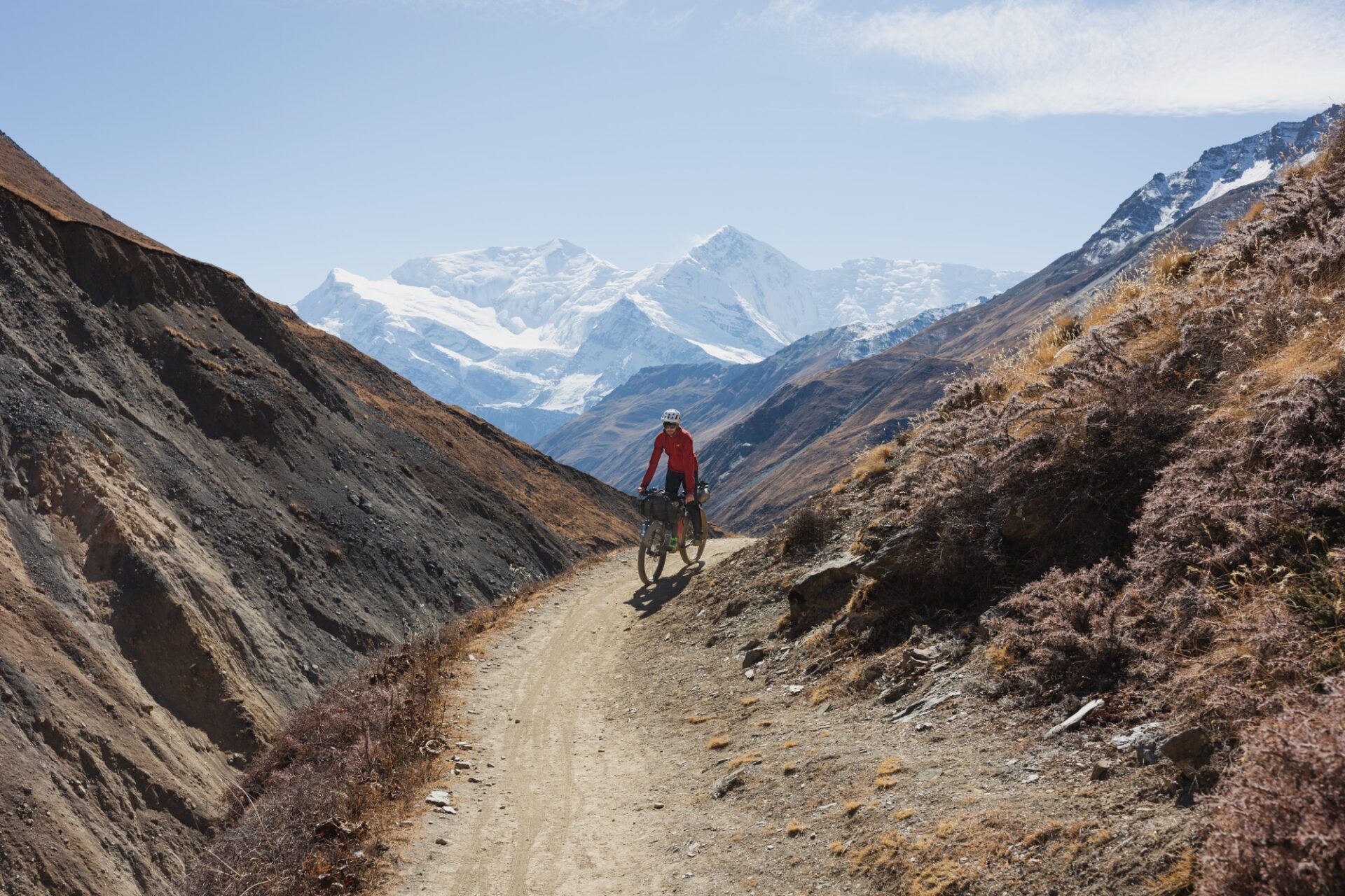 La idea de hacer el circuito de Annapurna en bici, básicamente una ruta de trekking, nació de unos artículos que Jess y yo vimos online. En 2005, se construyó una ruta de 4×4 paralelamente al sendero en el primer y último tercio del circuito para mejorar el acceso de los locales y el turismo. Esto abrió la posibilidad de hacerlo en bici, de modo que montamos las bicis y lo convertimos en una ruta de bikepacking. El primer día ya comprobamos lo difícil que sería la ruta. Las carreteras de gravilla son muy duras, como nada que haya visto. Las pendientes son realmente empinadas y hay rocas inmensas escondidas en el suelo.
