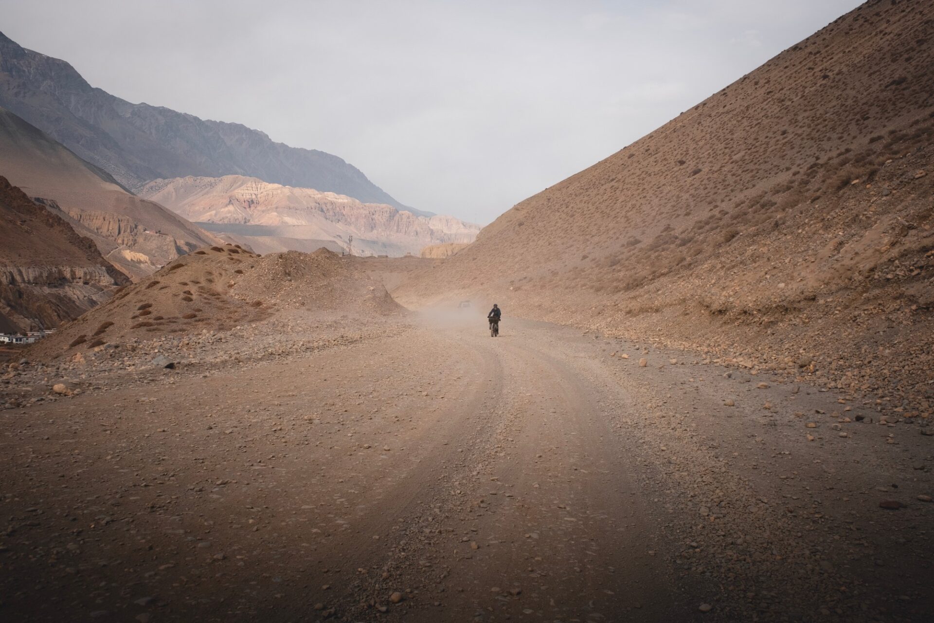Después del paso de Thorong La una red de secos y polvorientos caminos que siguen la garganta del Kali Gandaki, el desfiladero más profundo del mundo, te llevan hasta la sección asfaltada que fue construida para los monjes que querían llegar a los monasterios desde Muktinath hasta Kagbeni. Los últimos 7 días fueron cuesta abajo hasta llegar a la ciudad de Beni.