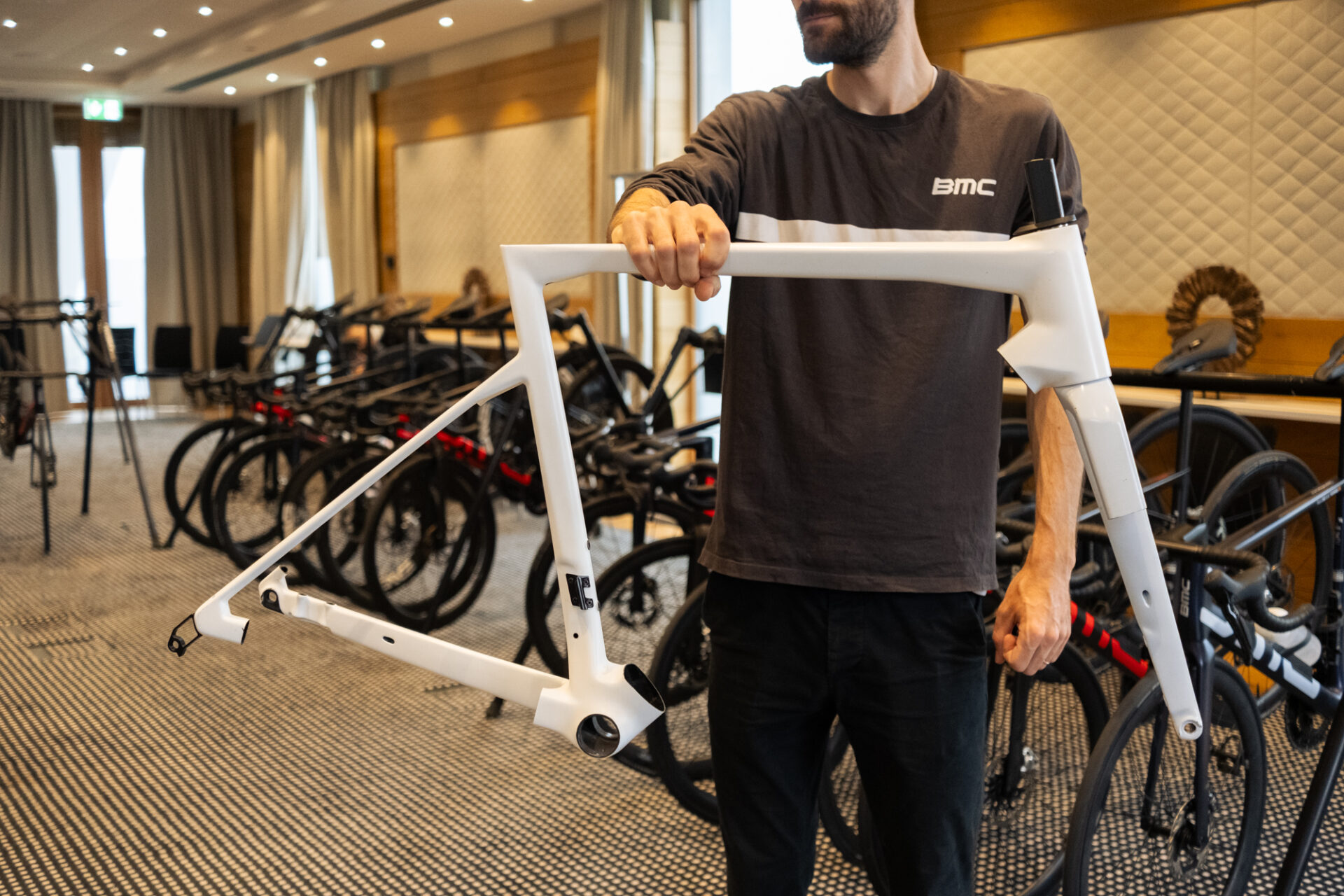 La presentación llevada a cabo por parte del equipo de BMC fue directa al grano y nos dejaron claro desde un inicio con un buen titular que la nueva Teammachine SLR 01 es más ligera, aerodinámica y rápida que su predecesora. Siguiendo esta línea comparativa, nos explicaron cómo han conseguido reducir un sorprendente 16% su peso (cuadro pintado en talla 54) e ilustraron gráficamente todo lo que tendrían que eliminar de un cuadro de la generación anterior para ajustarse al peso de la nueva SRL 01. Sin lugar a duda, nos dejaron impresionados con la demostración.