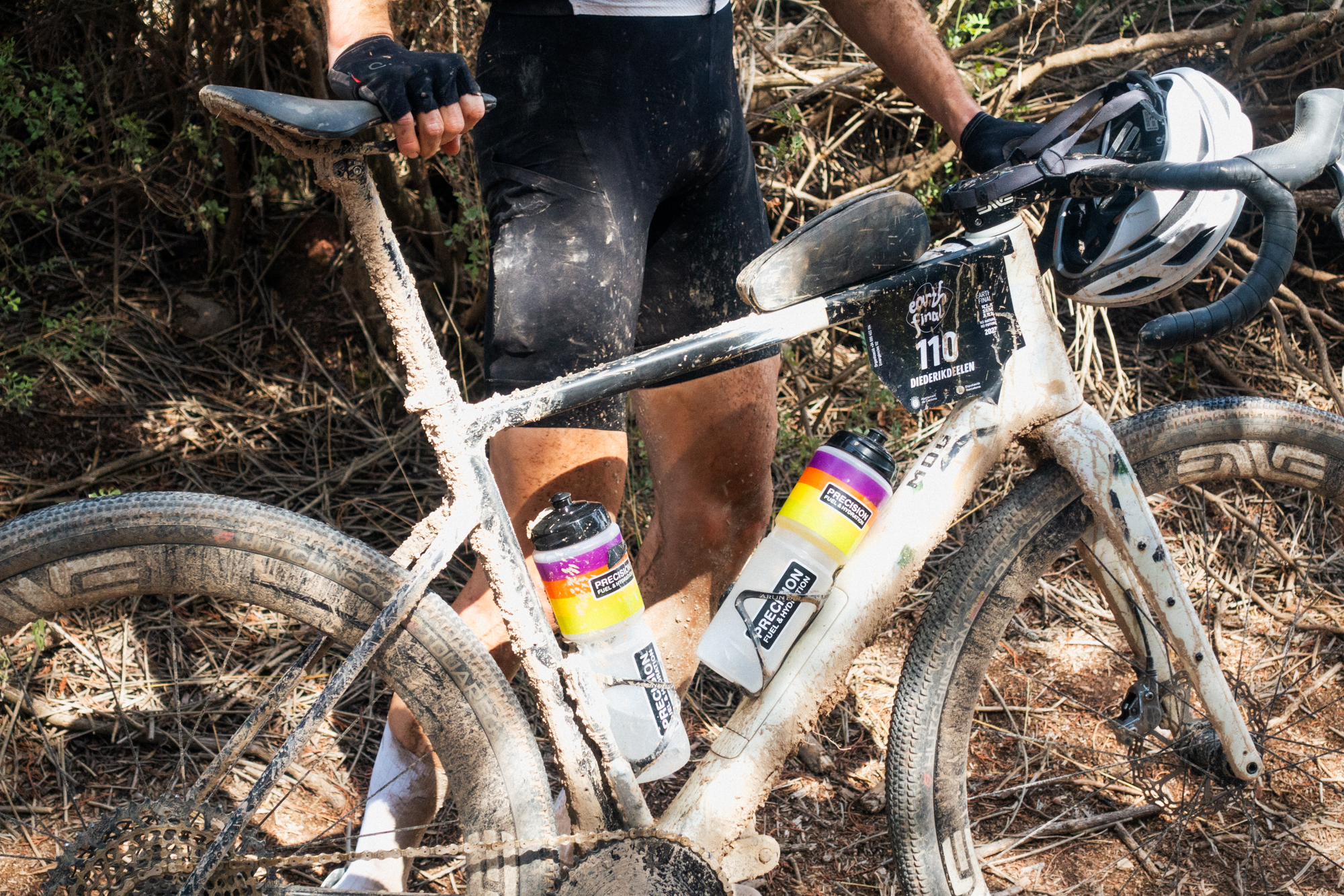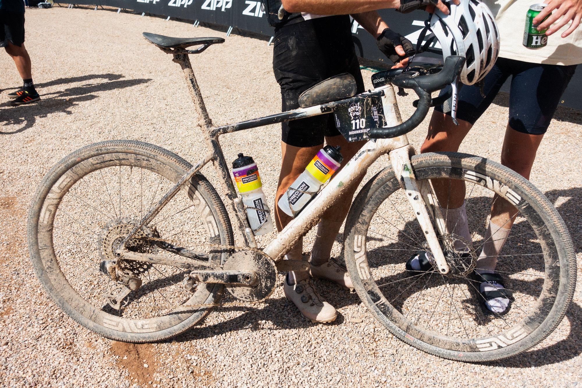Tuvo que esperar hasta después de The Traka para recibir su bici actual, y los neumáticos son el único componente que ha cambiado desde entonces. Empezó con Hutchinson Touareg de 40 mm pero últimamente compite con unos de 45 mm incluso en carreras no tan rocosas. El montaje se compone principalmente de componentes ENVE, SRAM y Ceramic Speed, con piezas adicionales como un plato Garbaruk para mantener intacto el aspecto de alta gama.