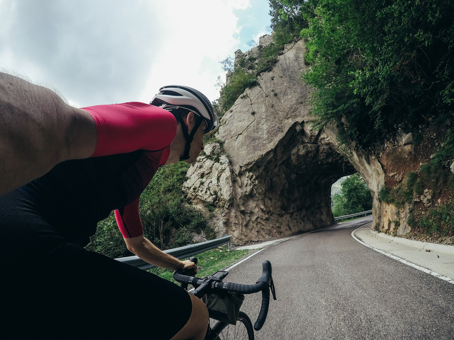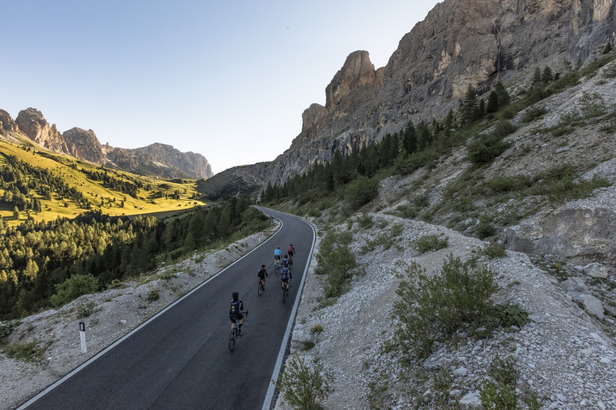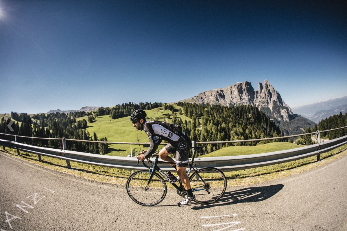 La primera edición fue en los Dolomitas italianos. Establecimos nuestro campamento base en Santa Cristina Valgardena, cerca de Bolzano, y en apenas tres días coronamos las cimas del Passo Sella, Pordoi, Giau, Falzarego Gardena, Valparola, Campolongo y Alpe di Siusi. ¡No nos dejamos ni uno! En total, 274 km con 7.900 m de desnivel acumulado.