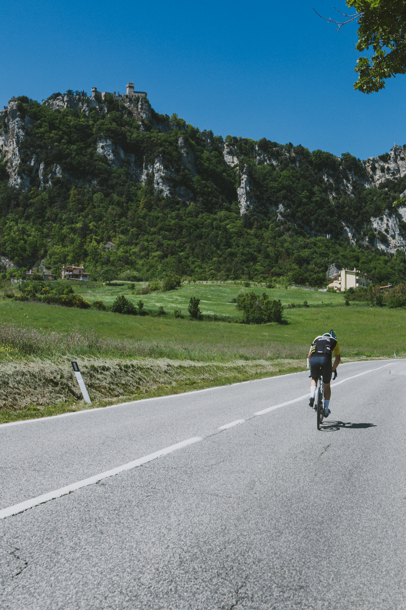 Nuestro hotel estaba ubicado en la costa, en Cattolica. Con un punto de partida así, hay varias opciones para los primeros kilómetros de ruta: seguir la costa para un paseo plano o dirigirse hacia el interior para afrontar las colinas. En nuestro primer día, nos embarcamos para explorar San Marino. La ruta nos llevó a través de los campos con un par de colinas aquí y allá antes de comenzar a subir a la histórica ciudad de San Marino. Las vistas se abrieron gradualmente con el mar a un lado y las montañas elevándose al otro, separando Emilia-Romaña y Toscana.