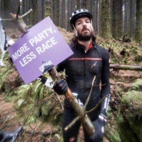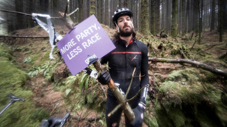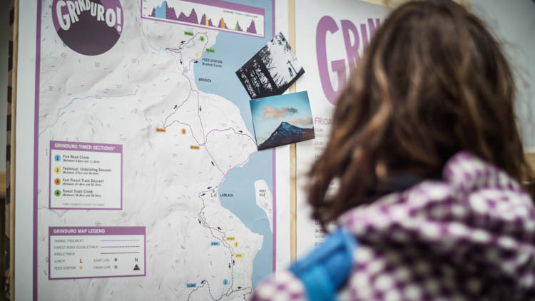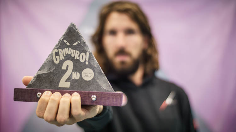 Detrás de la Grinduro está principalmente Giro y luego hay sponsors secundarios como Fabric u otros. Sin duda, es la carrera de bicis donde la imagen está más cuidada (sé que yo le doy especial importancia porque soy diseñador, pero realmente es importante). Por primera vez me hubiera comprado todo el merchandising, desde las zapatillas Giro de color lila pasando por parches, botellines, guantes y alguna freakada más. Otra cosa que me encanta de la Grinduro son los premios. ¡Desde la primera edición ya me tenían el corazón robado! Son 3 sillines Fabric con la imagen de la Grinduro, uno bronce, otro plata y obviamente el dorado. Y tuve la “suerte” de clasificarme y hacerme con uno de ellos. Otra cosa que me encantó fue ver a los jefazos de Giro currando como uno más, entregando dorsales, repartiendo comida o mojándose animando debajo de la lluvia. Este tipo de cosas son importantes y los americanos lo cuidan mucho. Lo hacen muy bien, cuidan los detalles y la organización es impecable y en ese sentido, tenemos que aprender mucho de ellos.