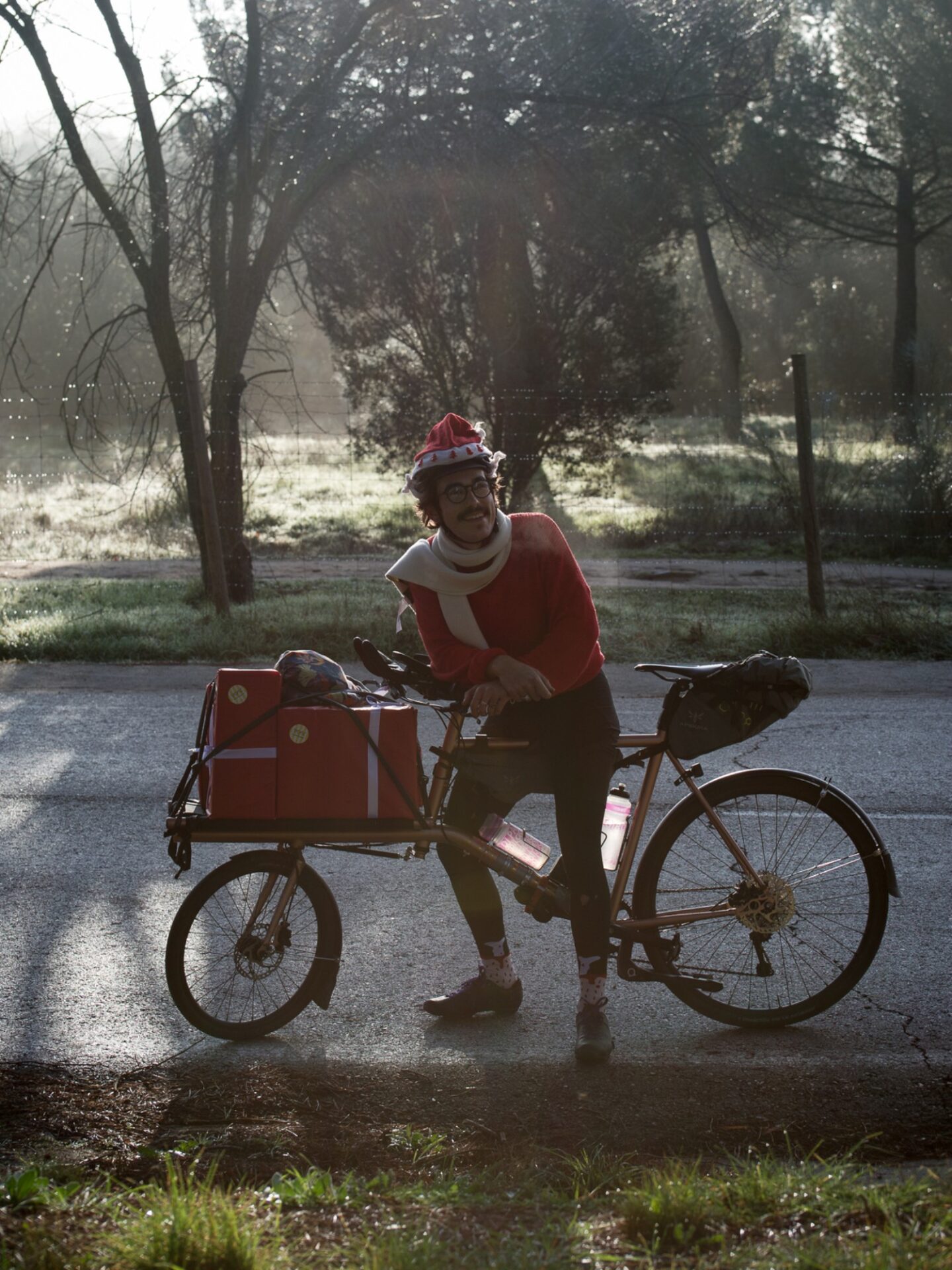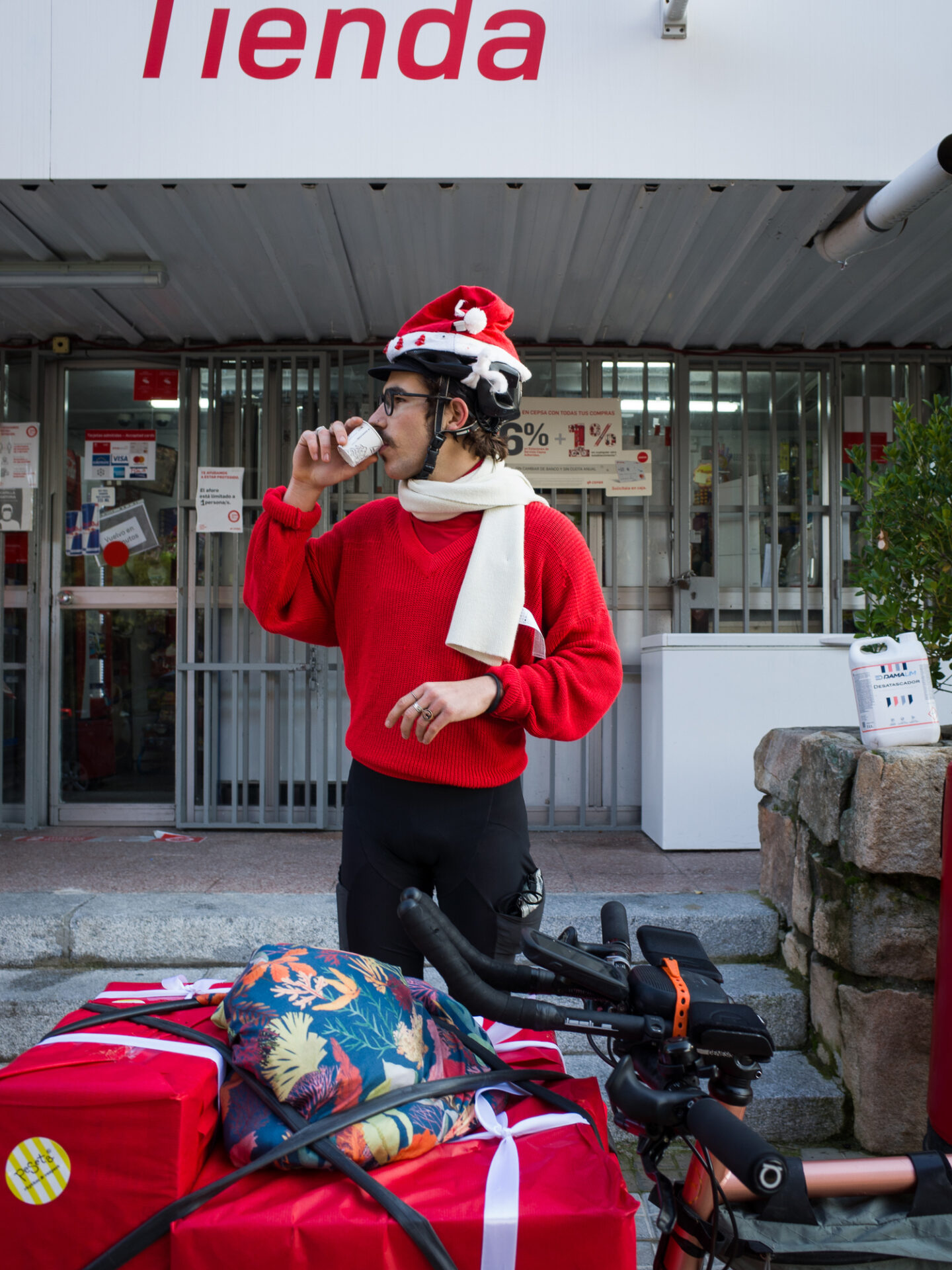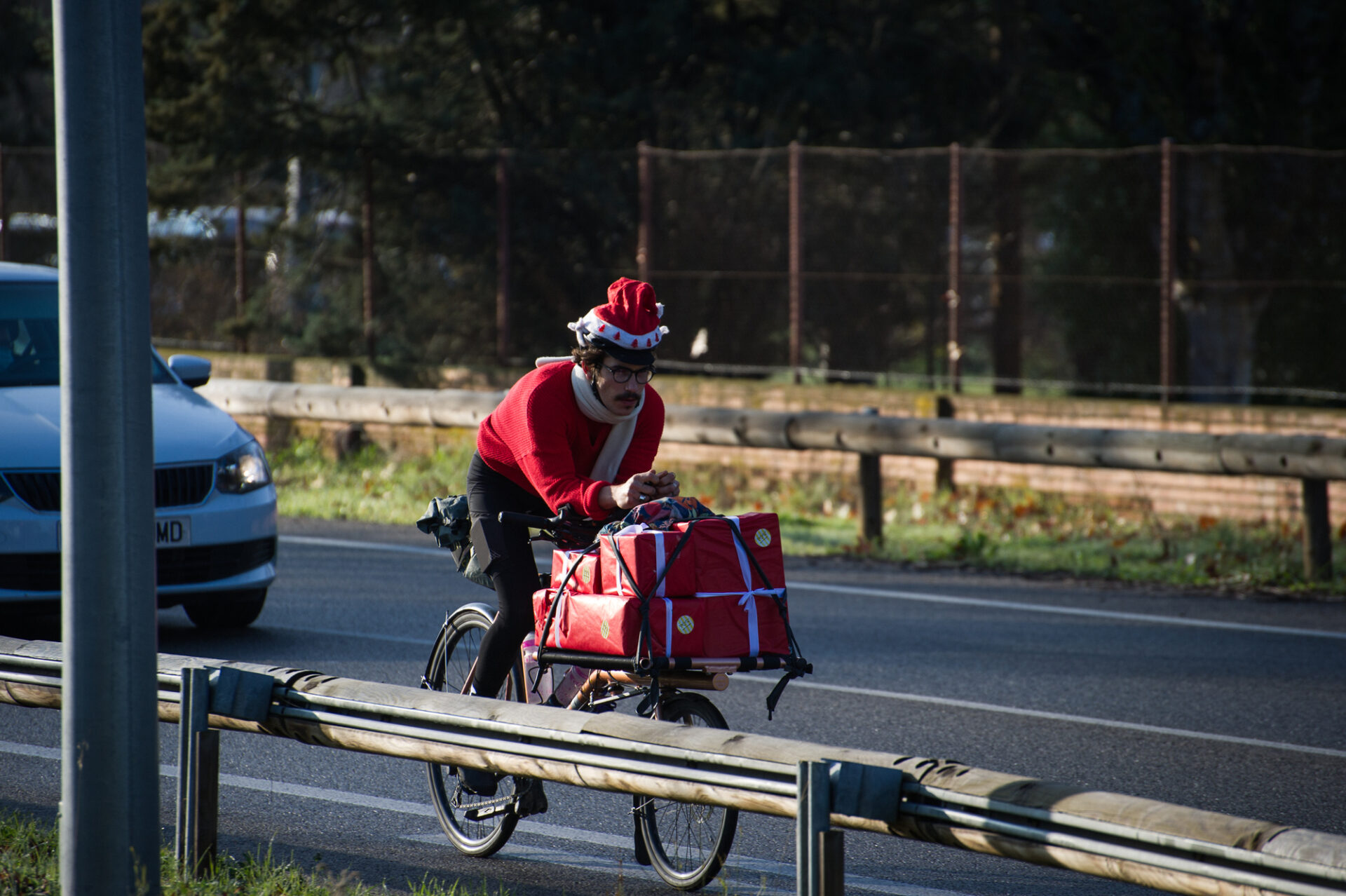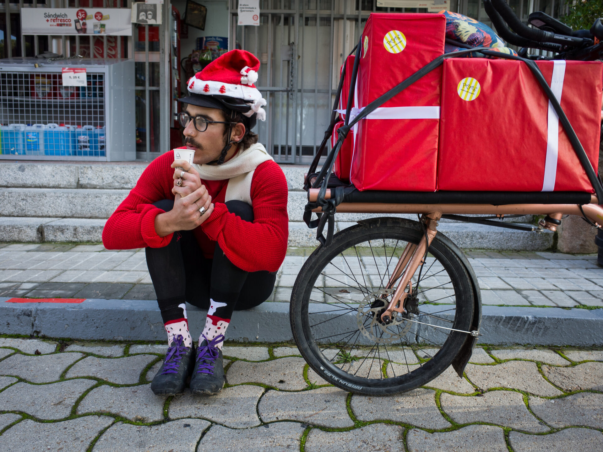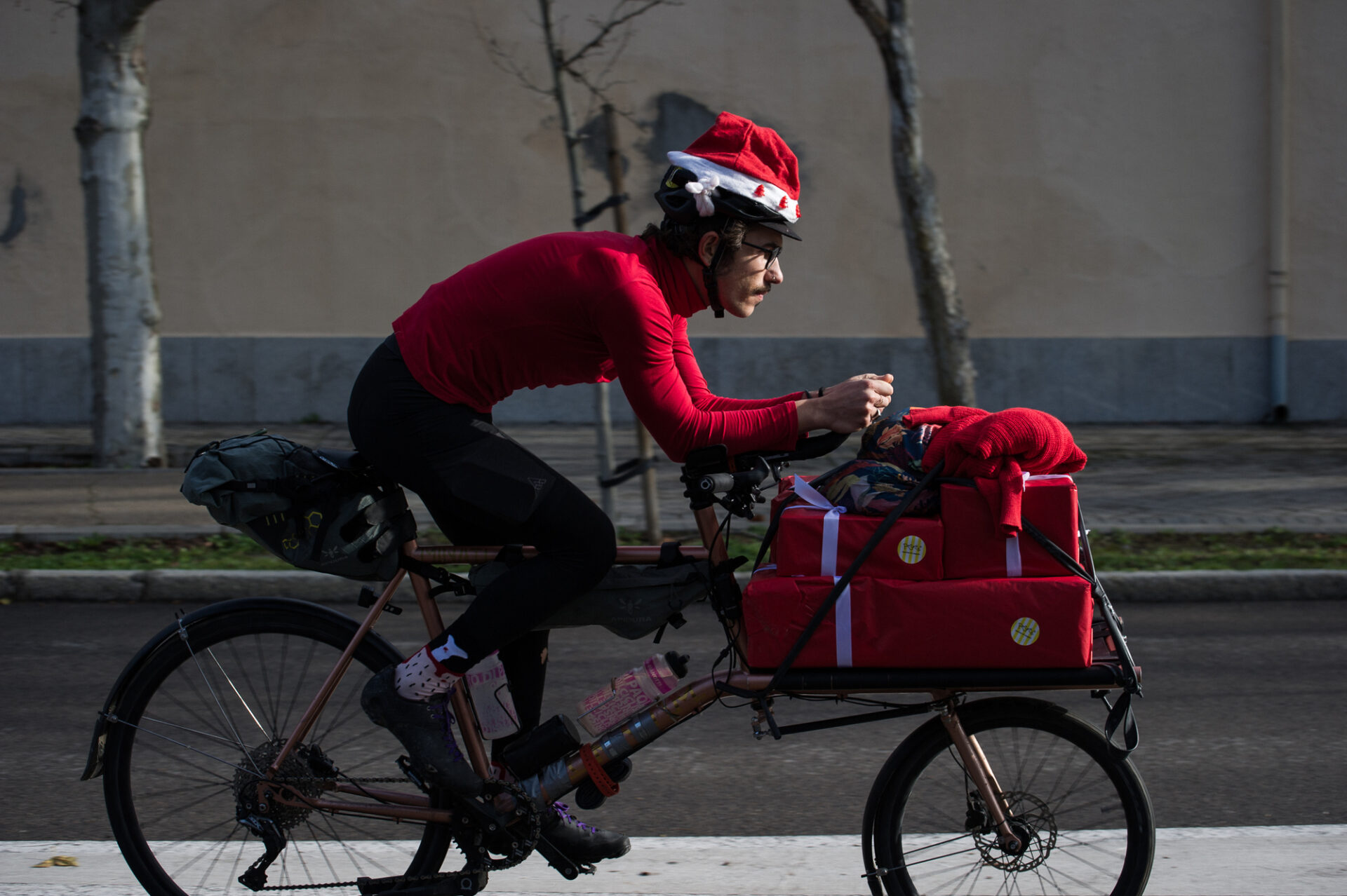 Las vacaciones de Navidad se caracterizan por reuniones con familiares y amigos, comidas infinitas, e intercambio de regalos. Para que esto suceda, en muchos casos es necesario que otros se encarguen de transportarlos a su destino, haciendo de Papá Noel a pequeña escala. Así, Jimbo, con la finalidad de entregar unos pedidos y dar visibilidad a las bicicletas de carga (cargobike) como un medio de transporte sostenible, se propuso hacer un servicio 24h-exprés de bicimensajería desde Madrid a Murcia cubriendo 350 km en menos de 17 horas para que todo el mundo tuviera sus regalos en Nochebuena.