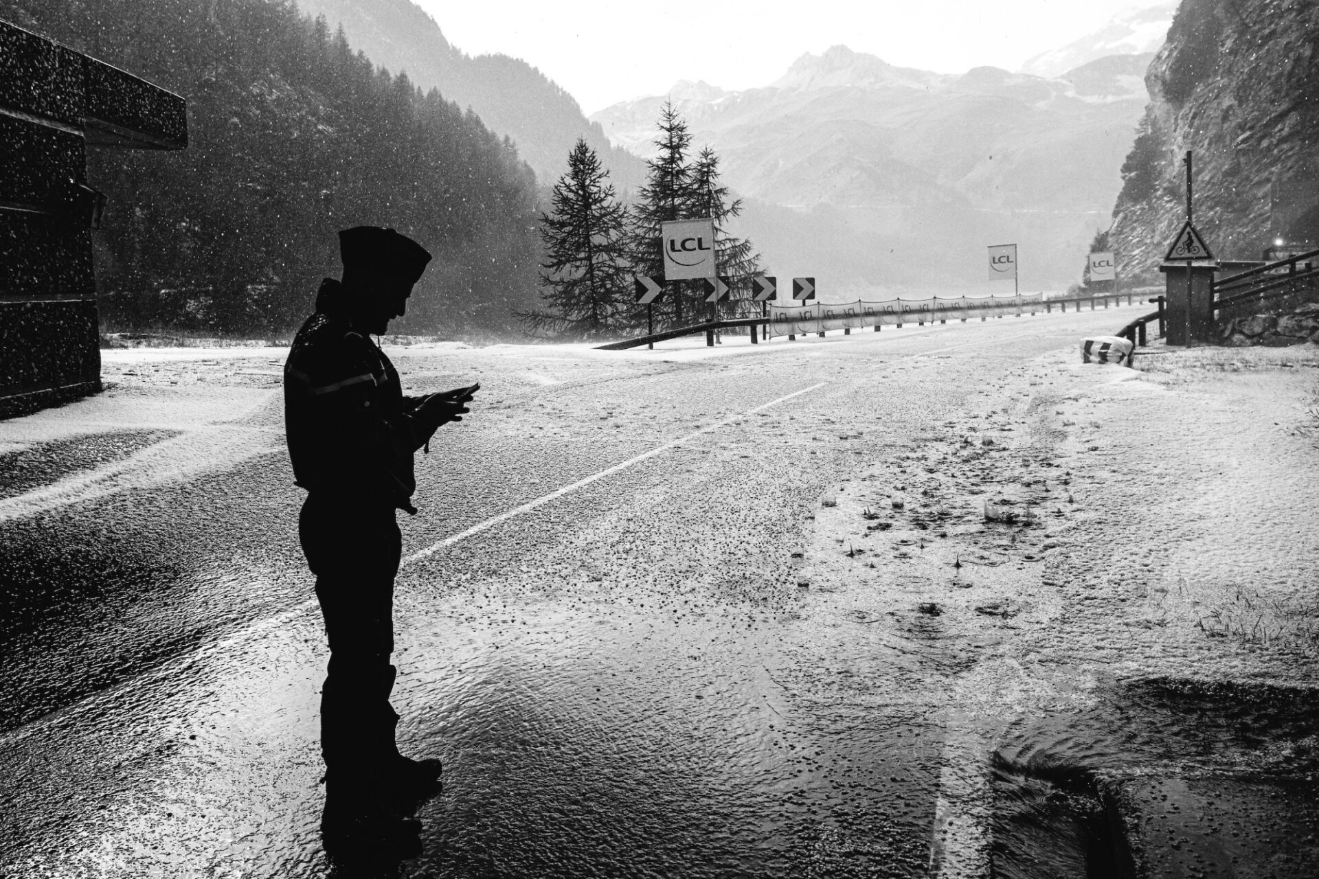 Cuando tomé esas fotos no sabia que la etapa iba a ser cancelada. Estaba a 5 km de la cima del Col d’Iseran (aún 30 km delante de la carrera). Me pasé 15 minutos andando y contemplando el paisaje. Mientras descendimos por la otra vertiente, todo era épico y precioso. Recuerdo que antes que la organización parase la carrera estábamos parados en un túnel. Un policía no nos dejaba pasar, y cuando lo hizo la carretera se empezó a llenar con barro, estaba allí mientras pasó. Fue emocionante, constantemente entrando y saliendo del coche tan rápido como podía para tomar fotos. No sé cómo llegué al último puerto, pero al llegar me dí cuenta que la carrera estaba suspendida. Sin embargo, sentí que estaba presenciando algo maravilloso.