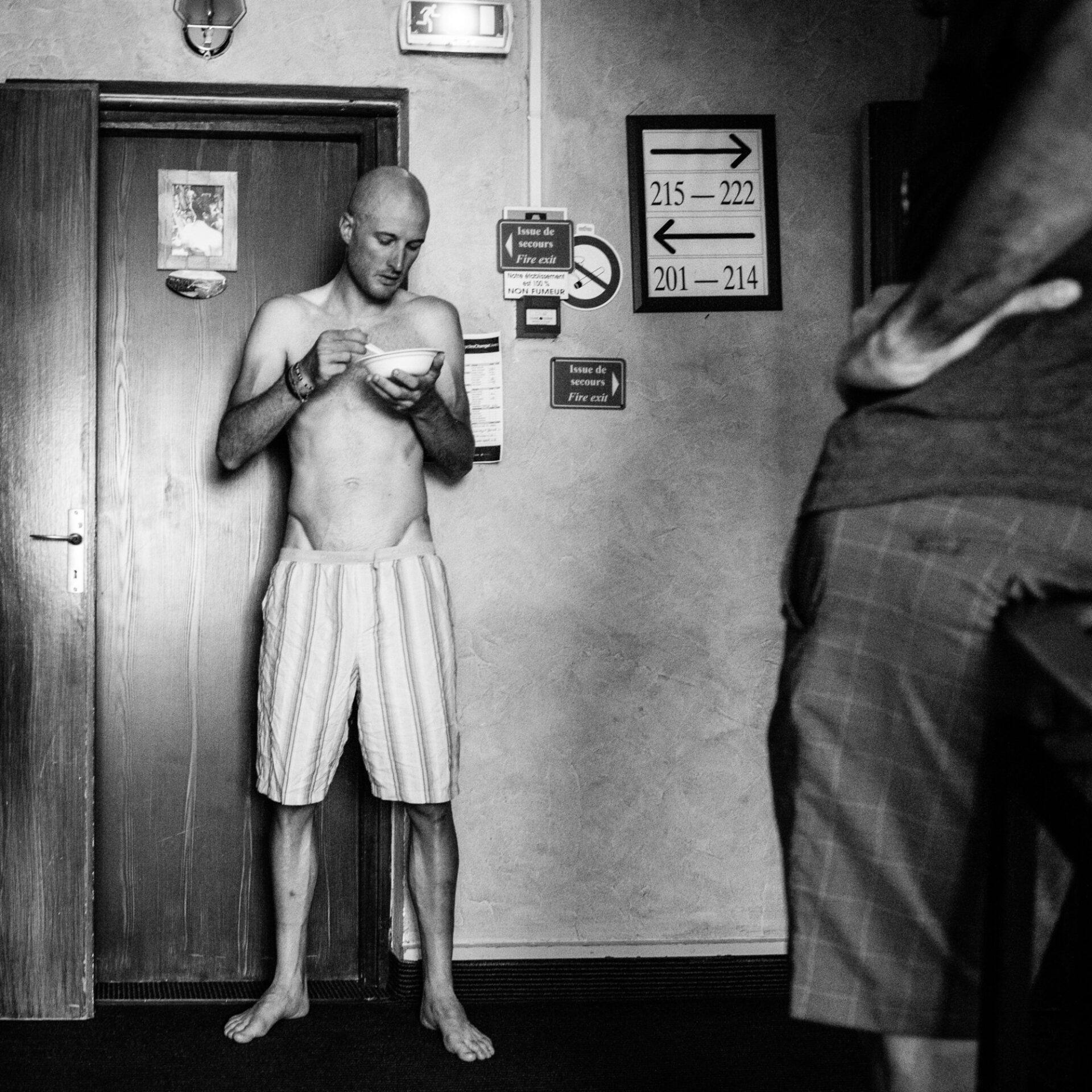 Realmente ves a la gente desmoronarse, y es extraño porque después de la meta hay muchas personas de los equipos, fotógrafos, televisión, organización, es bastante loco. En las duchas sólo hay 4 o 5 corredores, un momento íntimo (algunos lo encontrarán cruel), pero las imágenes son preciosas. Se trata realmente de exponer lo que está sucediendo. No me siento culpable de haber tomado esas fotos, todo el mundo sabe lo que pasa en Roubaix. Fue un momento puro de verdad, y transmite mucho de lo que el ciclismo es.