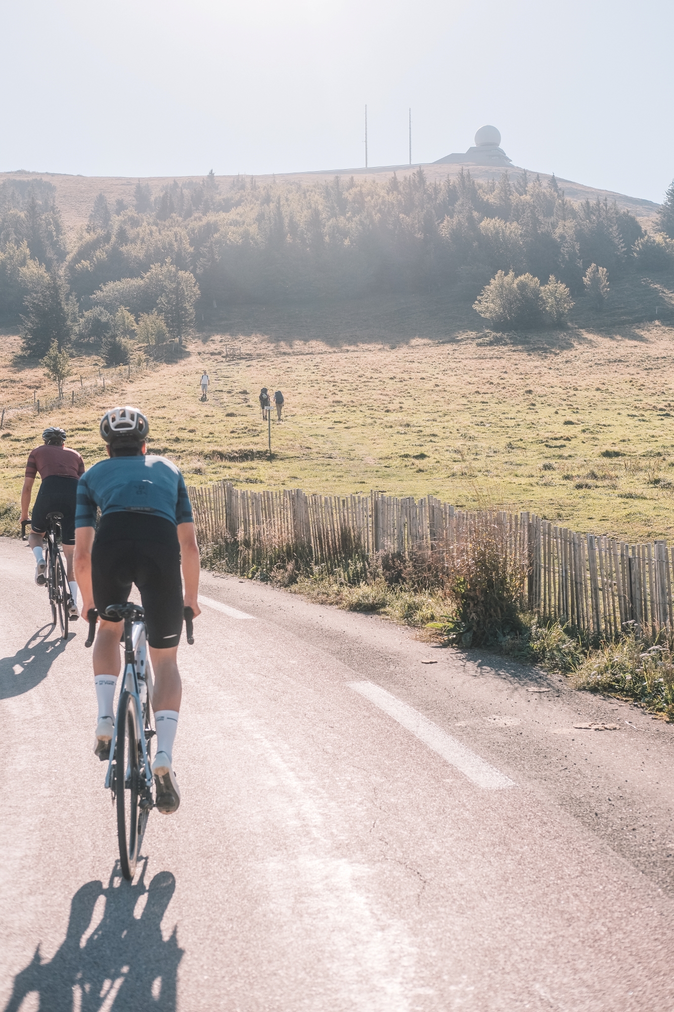 El sol brillaba y las sensaciones eran buenas, así que en poco tiempo tuvimos la cima del Grand Ballon a la vista. Como su nombre indica, en la parte superior hay una infraestructura en forma de globo, más concretamente un radar de tráfico aéreo. Sin embargo, el “balón” del nombre no hace referencia a esa estructura sino a la forma de la cumbre, que es más redondeada que los típicos picos rocosos. También nos recordó al monte Ventoux, dado el viento que hacía en la cima, lo que convirtió un agradable descenso en un ejercicio de concentración para asegurarnos de no ser tumbados por el viento.