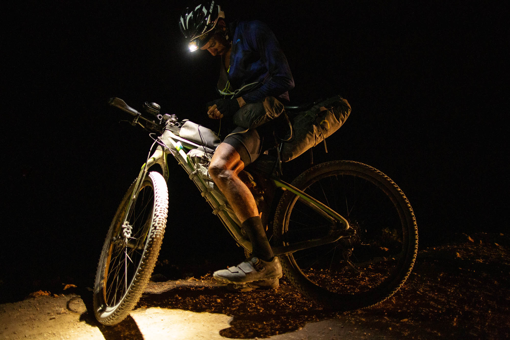 Usé la misma bici que en carreras anteriores. Uso una bici de montaña con horquilla rígida porque quiero ir en una posición cómoda. Además, puedo poner neumáticos anchos que, junto a mis ruedas Hunt Wheels, son magníficos. Tengo un manillar plano para los descensos y unos acoples para las largas secciones de grava. Si lo puedes hacer en una bicicleta gravel, también puedes en una BTT. Las diferencias en este tipo de carreras son varias horas, de modo que material super específico no marcará grandes diferencias. Para esta carrera cambié de un cassette 11×36 a uno 11×42 cassette. Fue una gran decisión porque en las cuestas podía pedalear tranquilamente. Por acabar, meto todo mi equipo y herramientas en bolsas Apidura de modo que tengo lo básico a mano y la ropa bien guardada.