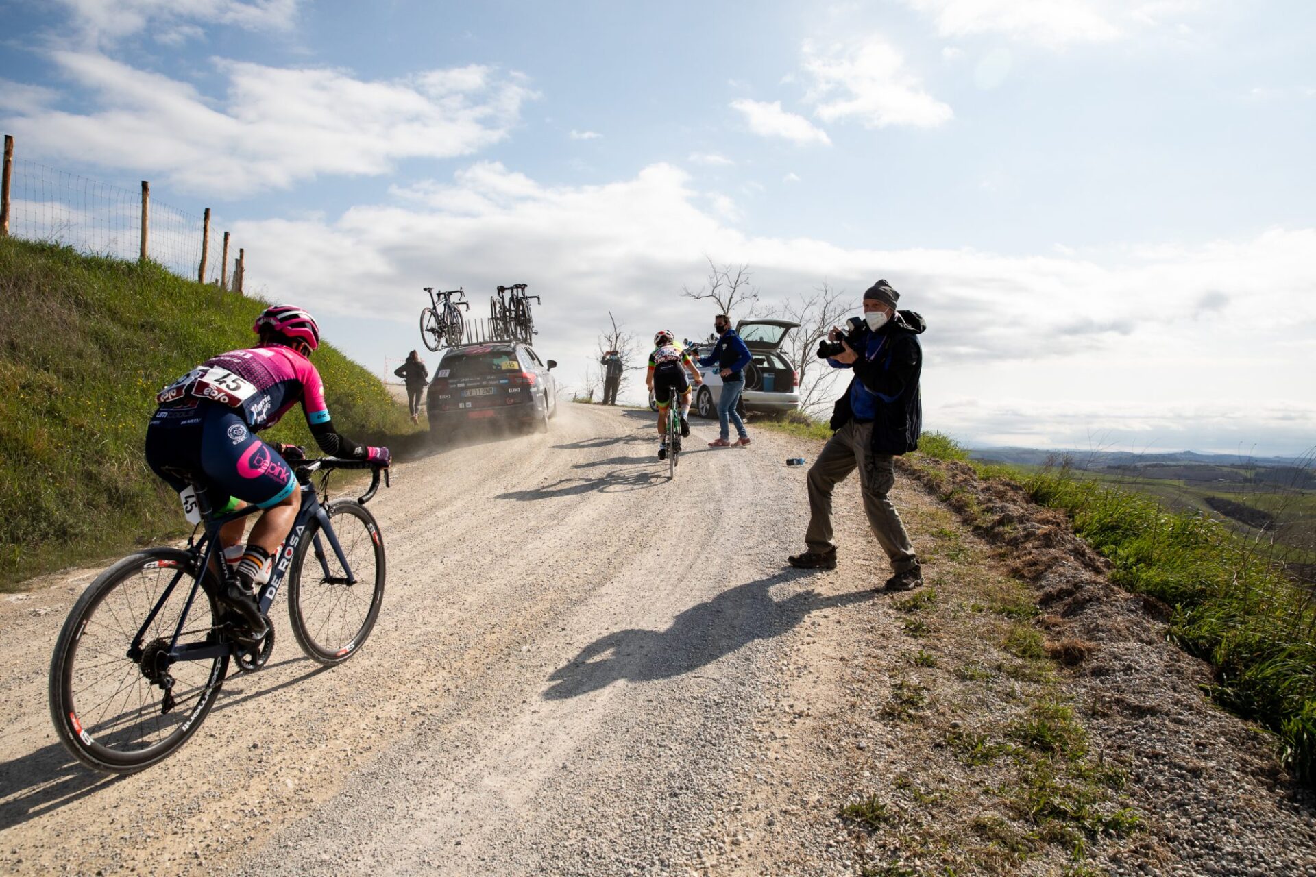Cuando pensamos en la Strade Bianche, siempre nos viene a la mente una imagen que muestra el paisaje de la Toscana y uno de sus sectores de sterrato desde lo alto de una colina. Hay algunos puntos del recorrido en los que los fotógrafos siempre tienen la mirada puesta, y Laura sonríe al recordar la situación en la que algunos de ellos estaban todos parados más o menos en el mismo lugar, tomando fotos muy parecidas.