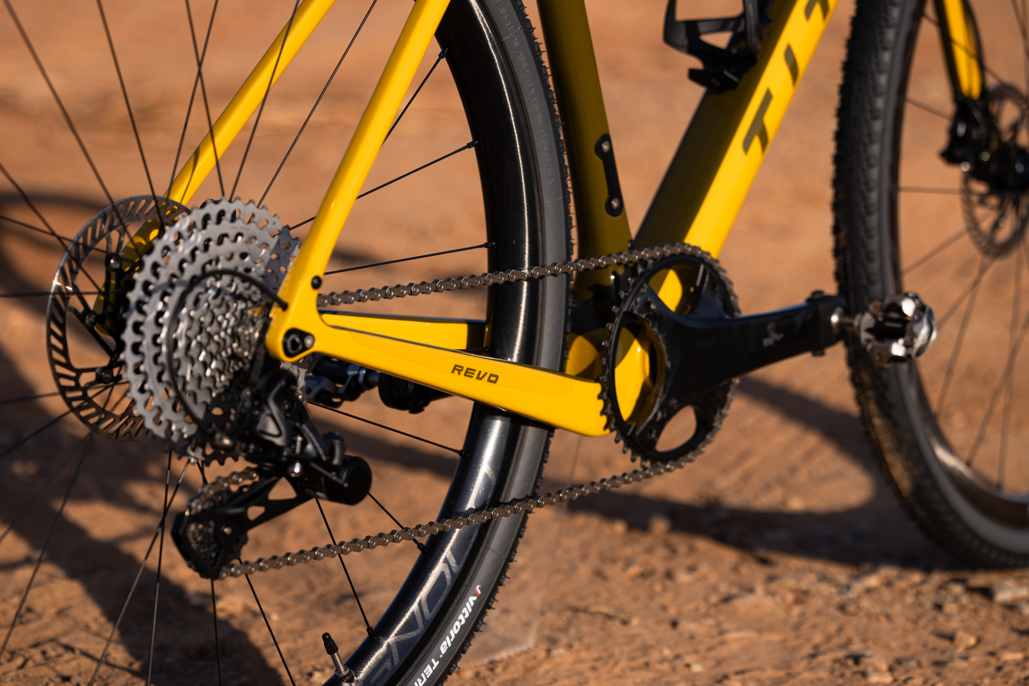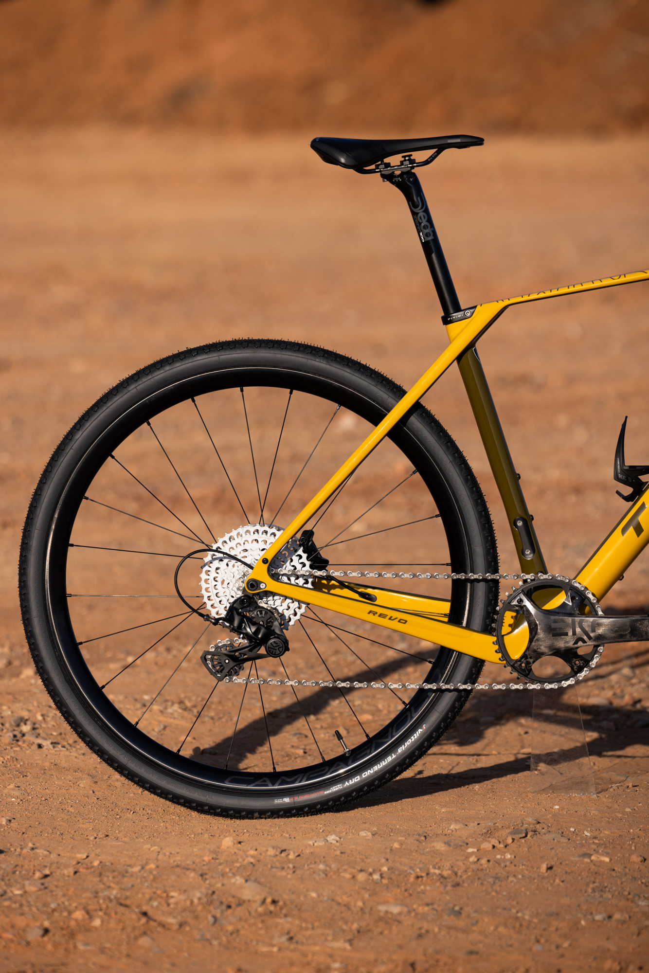 Si revisamos la parte trasera, encontramos varios aspectos que llaman nuestra atención. Las vainas, en lugar de unirse al tubo vertical, se unen directamente al tubo horizontal. Según la marca, esto refuerza uno de los puntos dónde se ejerce mucha fuerza y beneficia a la resistencia y estabilidad del cuadro. El paso de rueda que ofrece la Revo, permite la instalación de neumáticos de hasta 700c x 50mm (o 650b x 2.1”), lo que garantiza la diversión encima de la bici y una mayor seguridad a la hora de afrontar terrenos de los más exigentes.