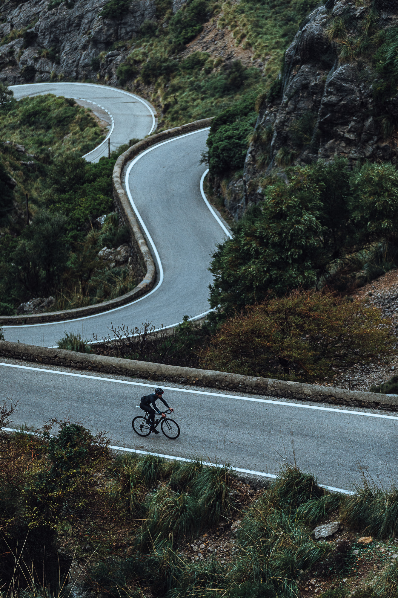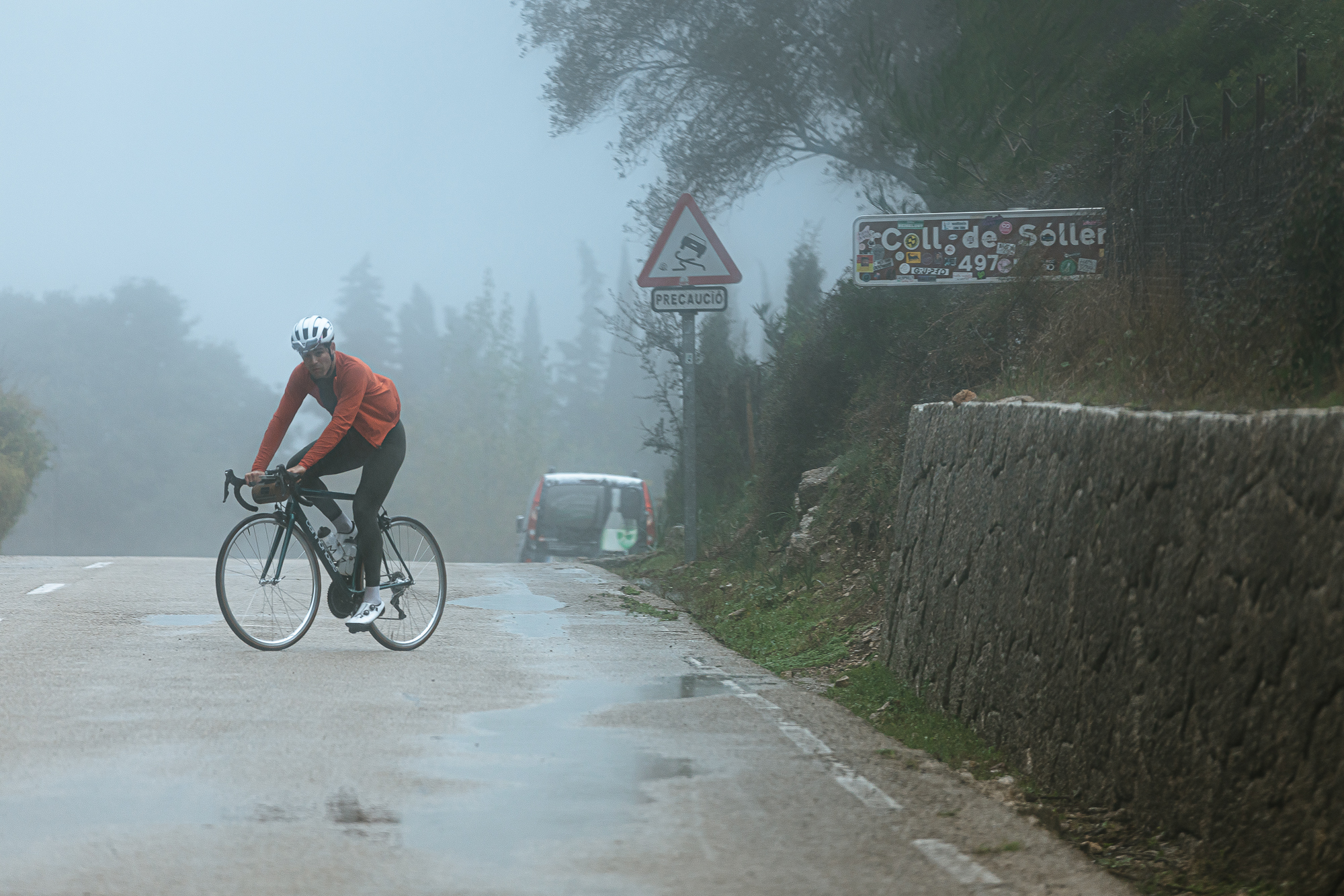 Desde allí, nos adentramos en la Serra de Tramuntana a través del Coll de Sóller (6.8 km con una media del 4.6%). Al inicio del puerto empezó a caer una lluvia fina que poco tardó en convertirse en más abundante y pasadas tres curvas nos dejó empapados de arriba a abajo. Coronamos sin detenernos y nos dejamos caer hacía la otra vertiente, donde nos reagruparíamos en algún lugar bajo techo.
