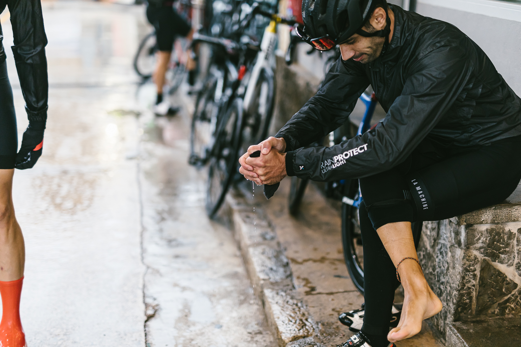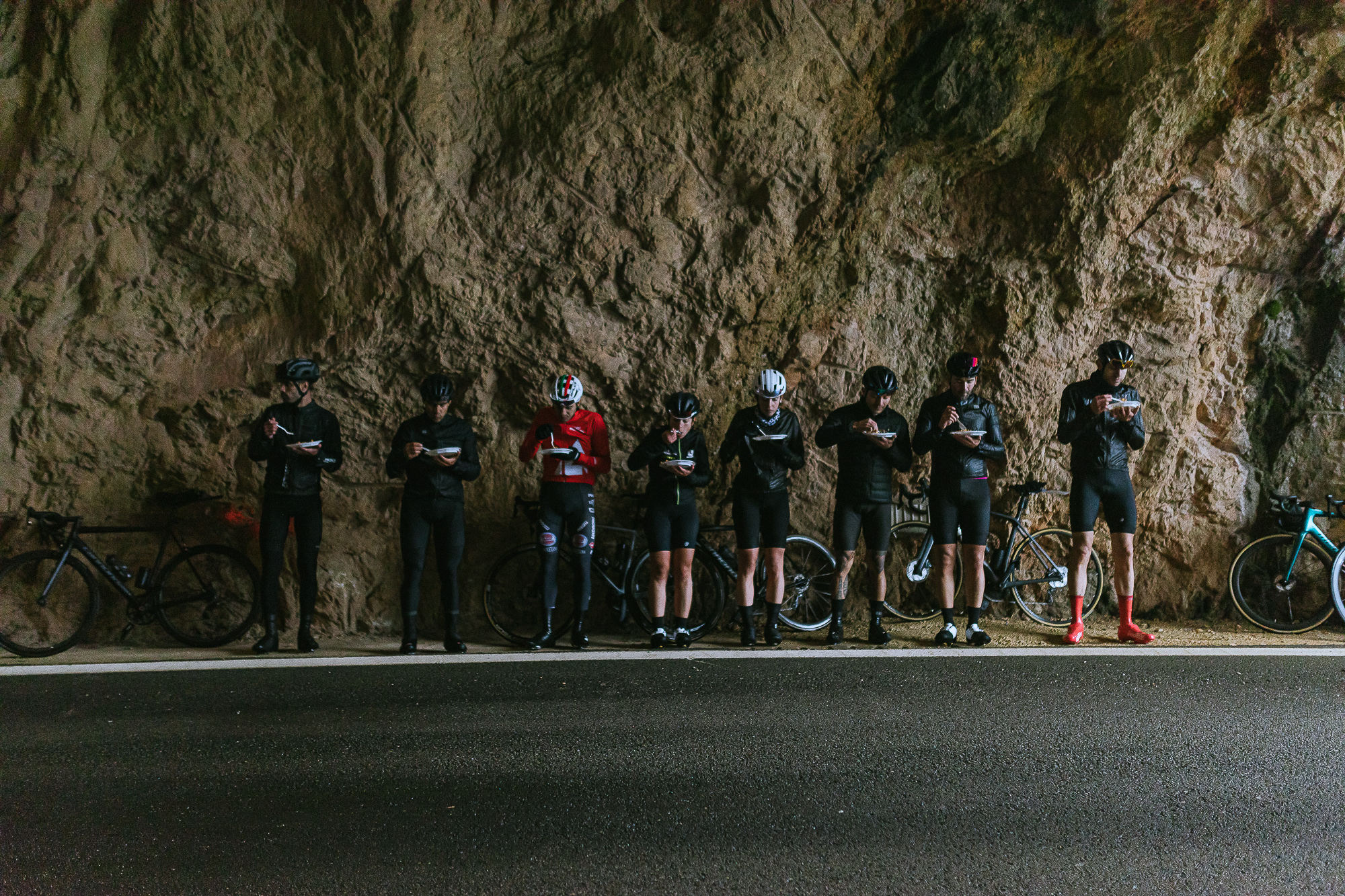 Tras reagruparnos una vez arriba, optamos por hacer una parada para comer antes de afrontar otro de los grandes highlights del día: Sa Calobra. Llevábamos cerca de 80 km y la lluvia nos brindó un segundo asalto. Refugiados bajo un túnel con hermosas vistas al Gorg Blau y con escalofríos provocados por el agua y el frío, comimos un improvisado plato de pasta y recuperamos algo de fuerzas para afrontar la segunda parte de la ruta.