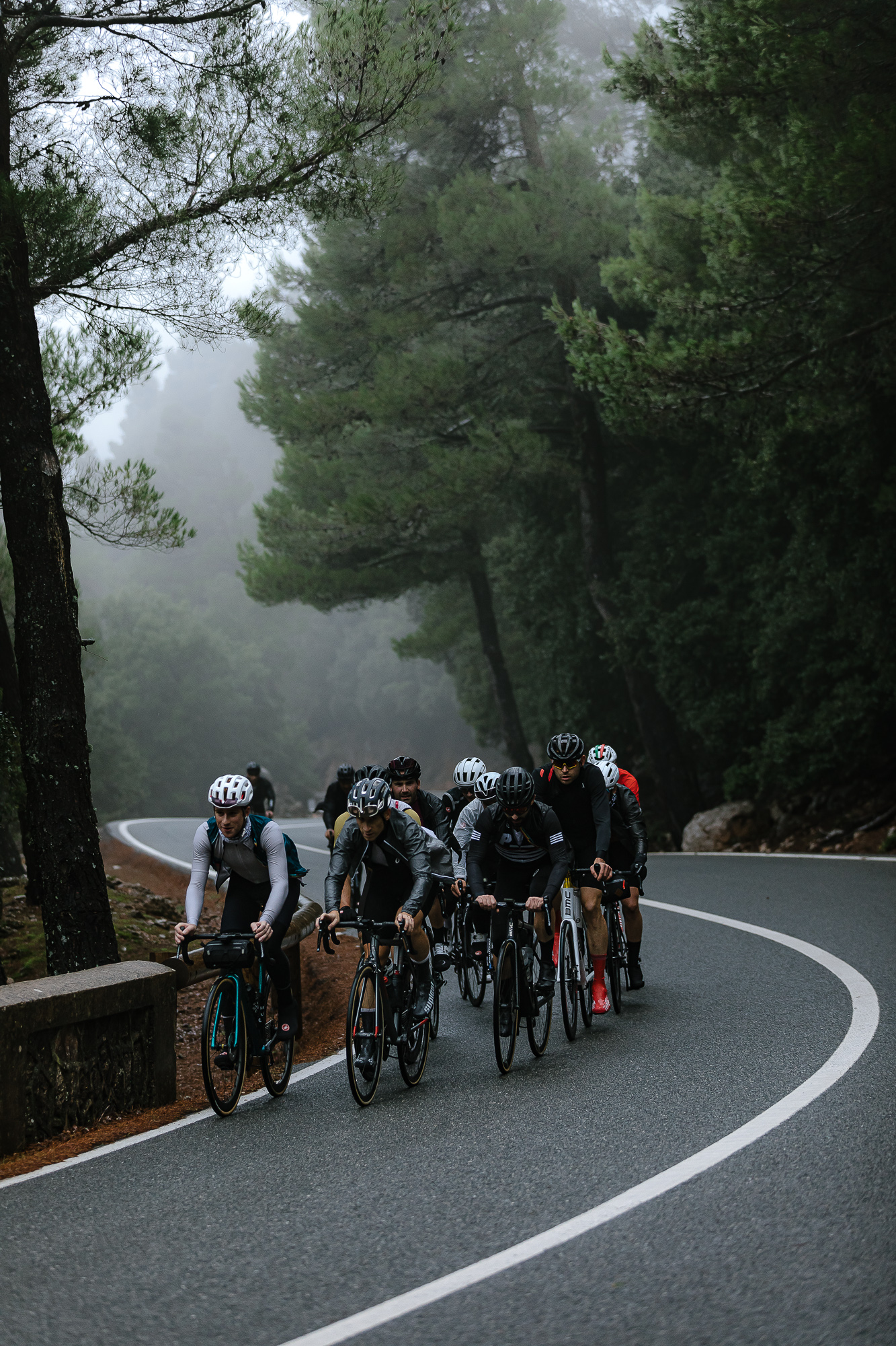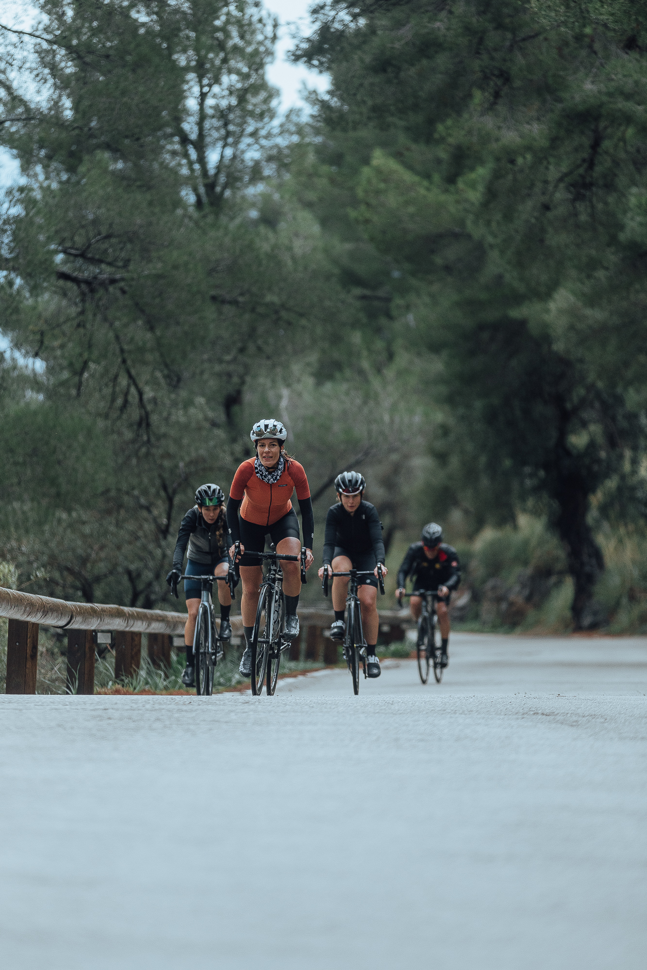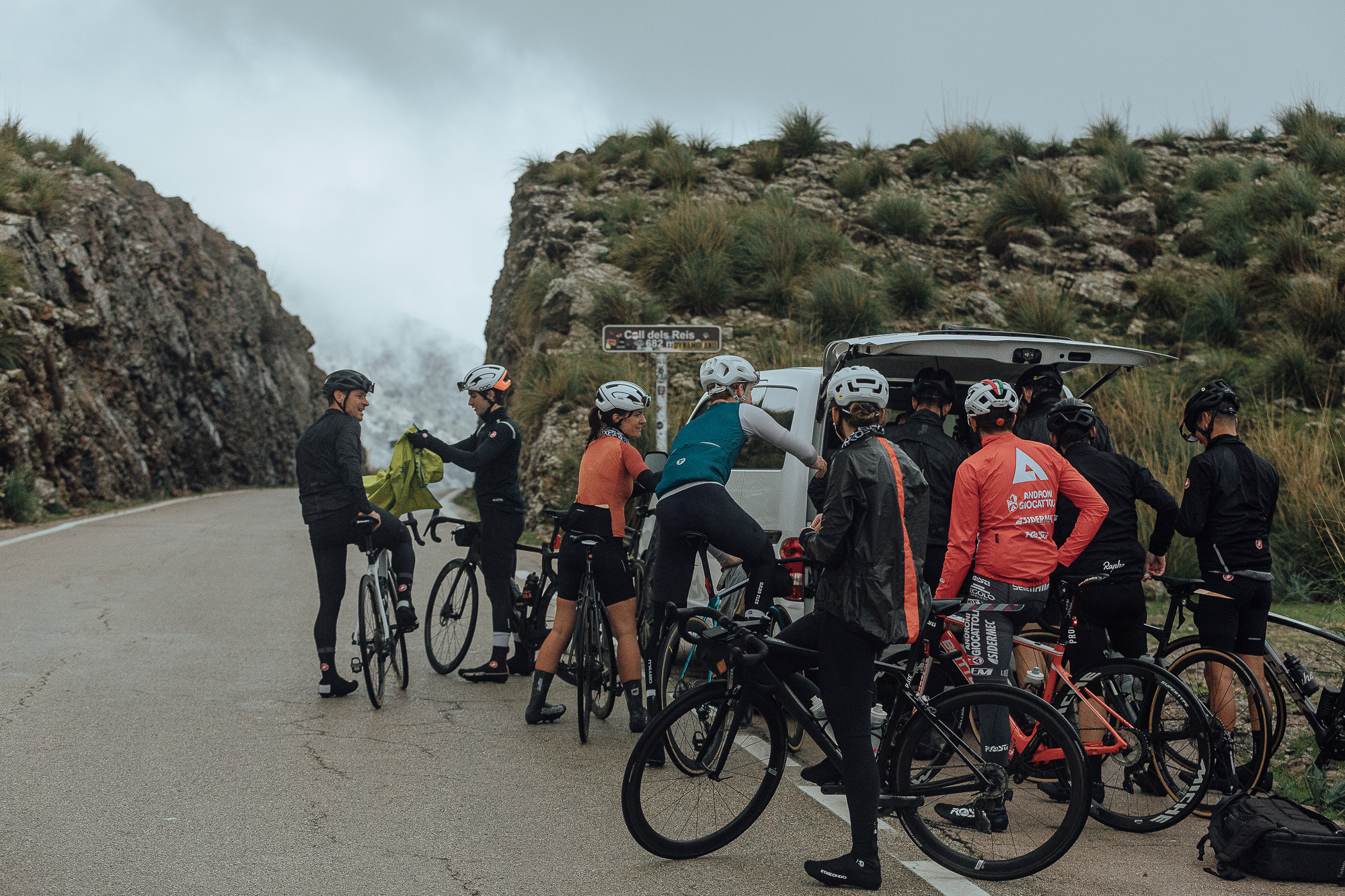 Una vez equipados y sin apenas lluvia, iniciamos el ascenso al Puig Major, la montaña más alta de las Islas Baleares (1.445 m). Cuenta con unos 14 km al 6% y, pese a no ser especialmente dura, es una ascensión que si se hace a ritmo alto, acaba siendo exigente. La disfrutamos mucho y, a medida que nos acercábamos a la cima, aparecieron los primeros ataques del día entre los integrantes del grupo de cabeza.