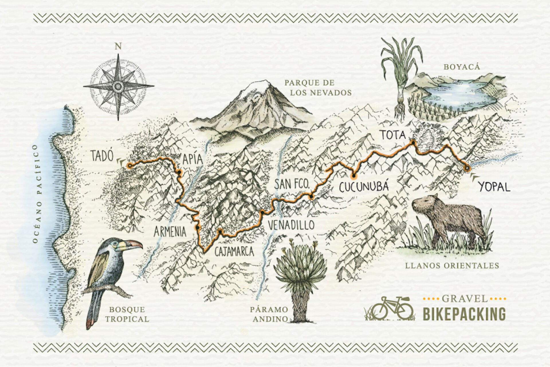 Por razones históricas los colombianos han tendido a vivir en las montañas, lo que se ha traducido en una red extensa que conecta pueblos y valles a través de pasos entre cordilleras. La región central de Colombia está definida por los Andes y dividida en tres cordilleras: oriental, central y occidental. Con la intención de adentrarse y conocer el país, se propusieron el reto de unir las tres en bicicleta en lo que sería una ruta de bikepacking gravel.