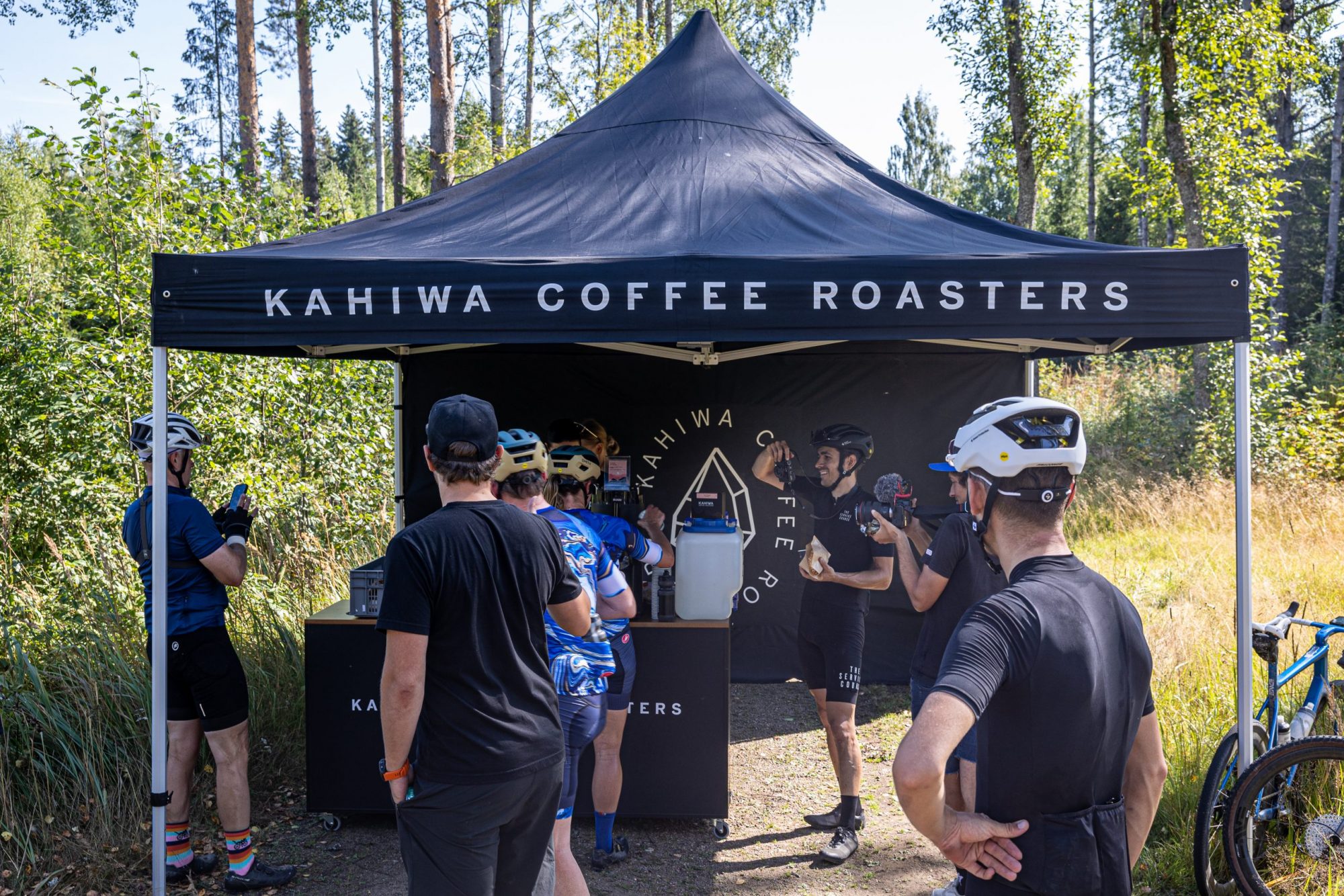 Riding on tarmac felt weird, as the first 55 kilometers were entirely off-road. In the morning we were told that there was going to be a coffee stop, so we thought that at some point we would pass by a city where we would find a place to sit. Without asking anyone we realized that it was not going to be the case, as we barely came across a handful of isolated houses in the first 100 kilometers. In the middle of nowhere, the people from Kahiwa Coffee Roasters had set a tent ready to provide us with the caffeine shots we needed and some korvapuusti, the local pastry par excellence.