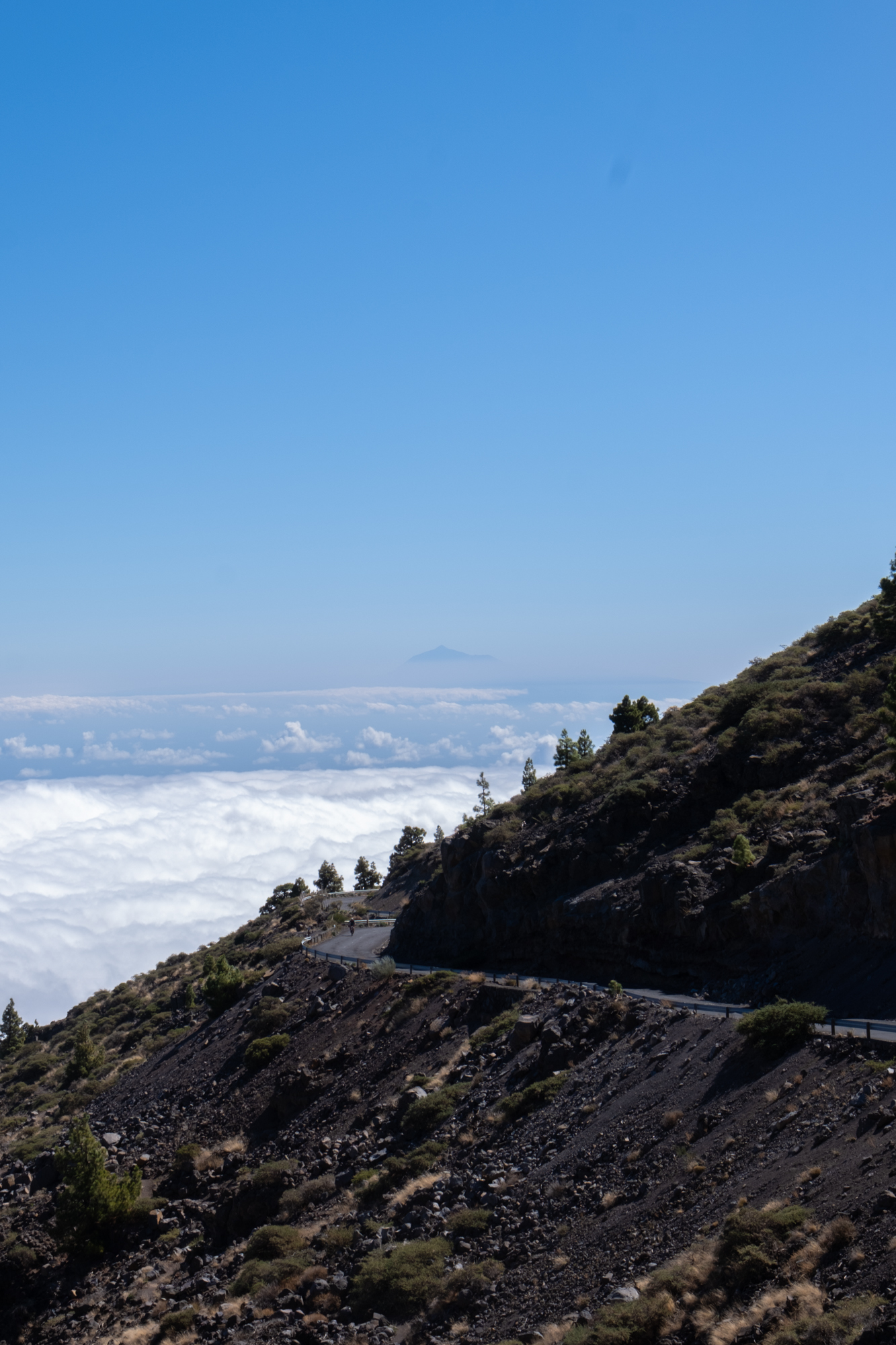 At the end of the path, we were suddenly above the clouds, with the magnificent El Teide in the background, located on the neighboring island of Tenerife. From then on we would proceed with our ascent on a perfectly paved road, with only a brief stop at the provisioning point.