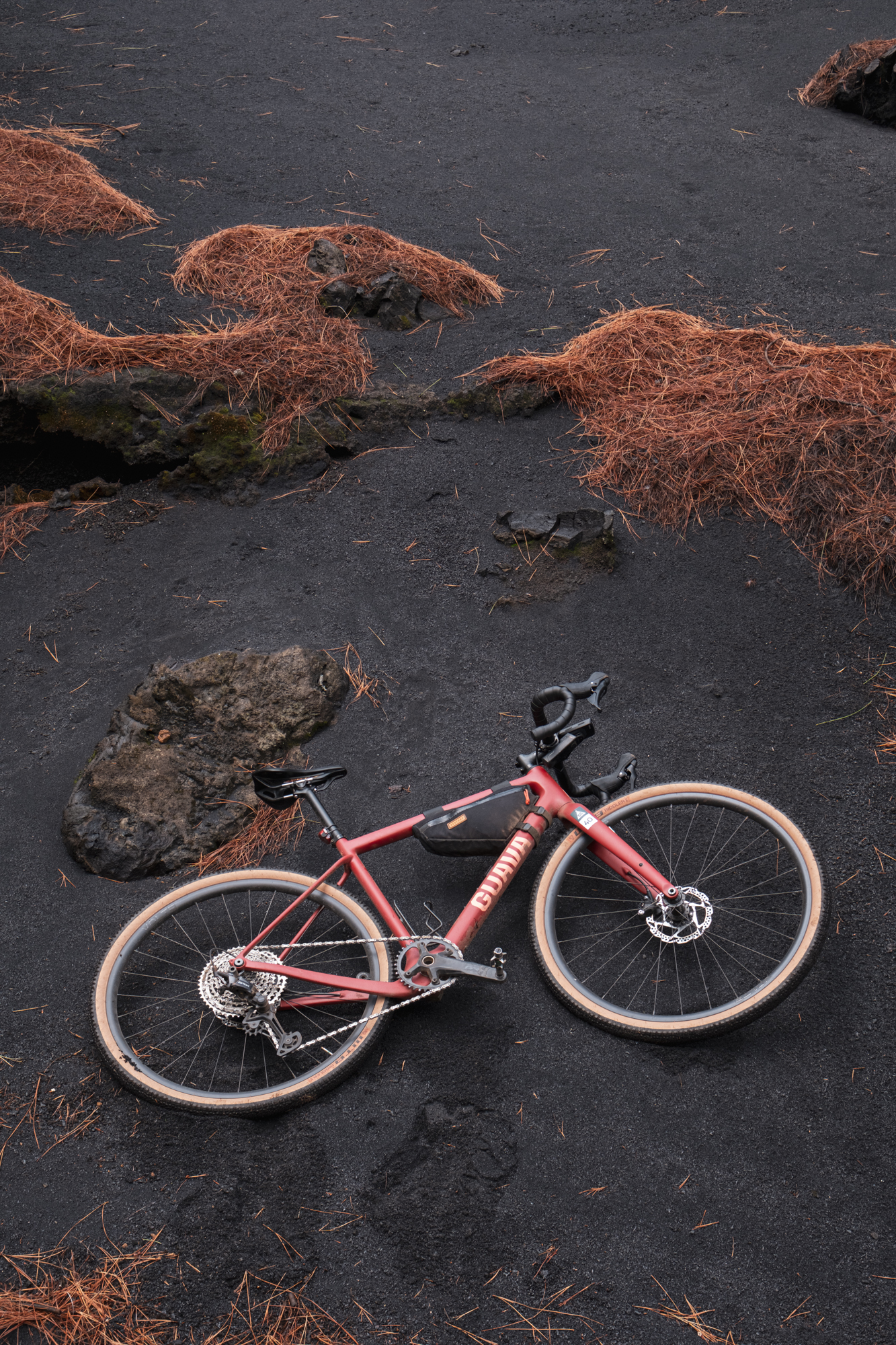 During the previous night’s briefing, we were told there was a 2 km hike-a-bike section, but we didn’t know exactly where. We thought we would be able to ride all of it, as it was technical but still somewhat rideable. However, we had to put our feet on the ground when we hit a sandpit of volcanic ashes. Black sand. We had never thought we would be riding over the traces of a recent eruption, and once again Gravel Ground delighted us with some unique moments.