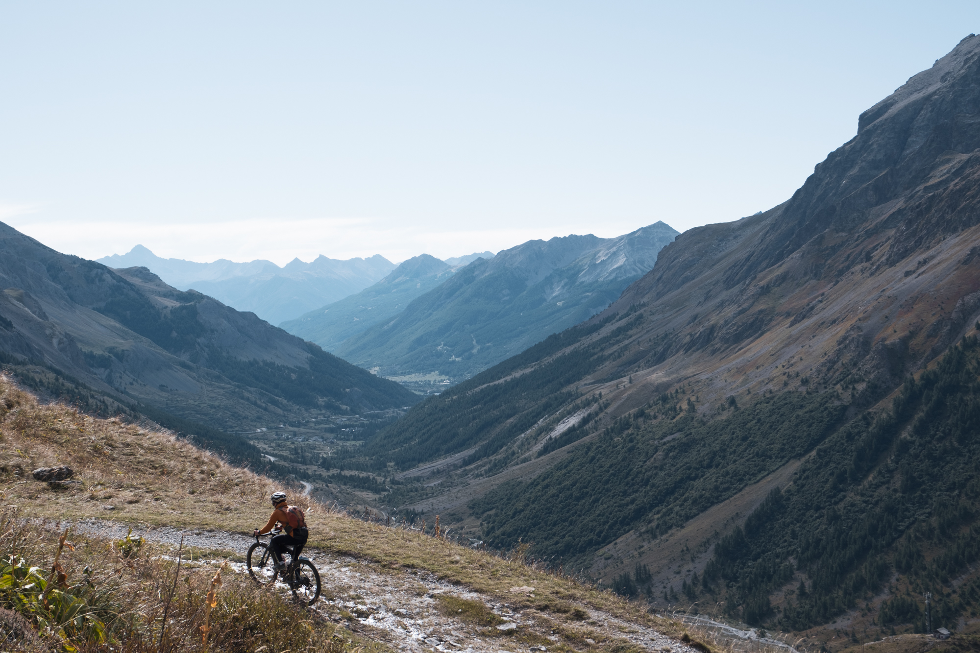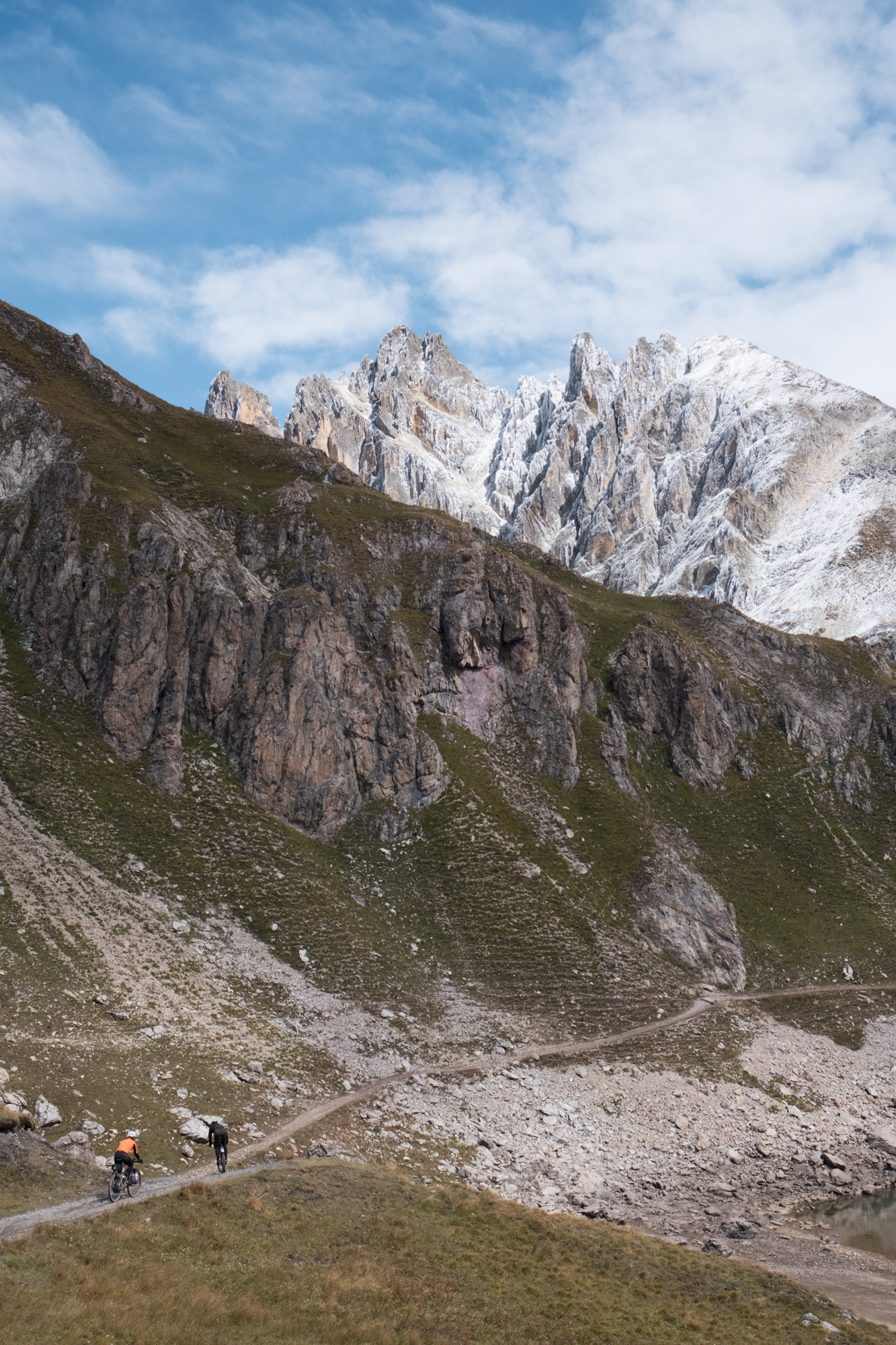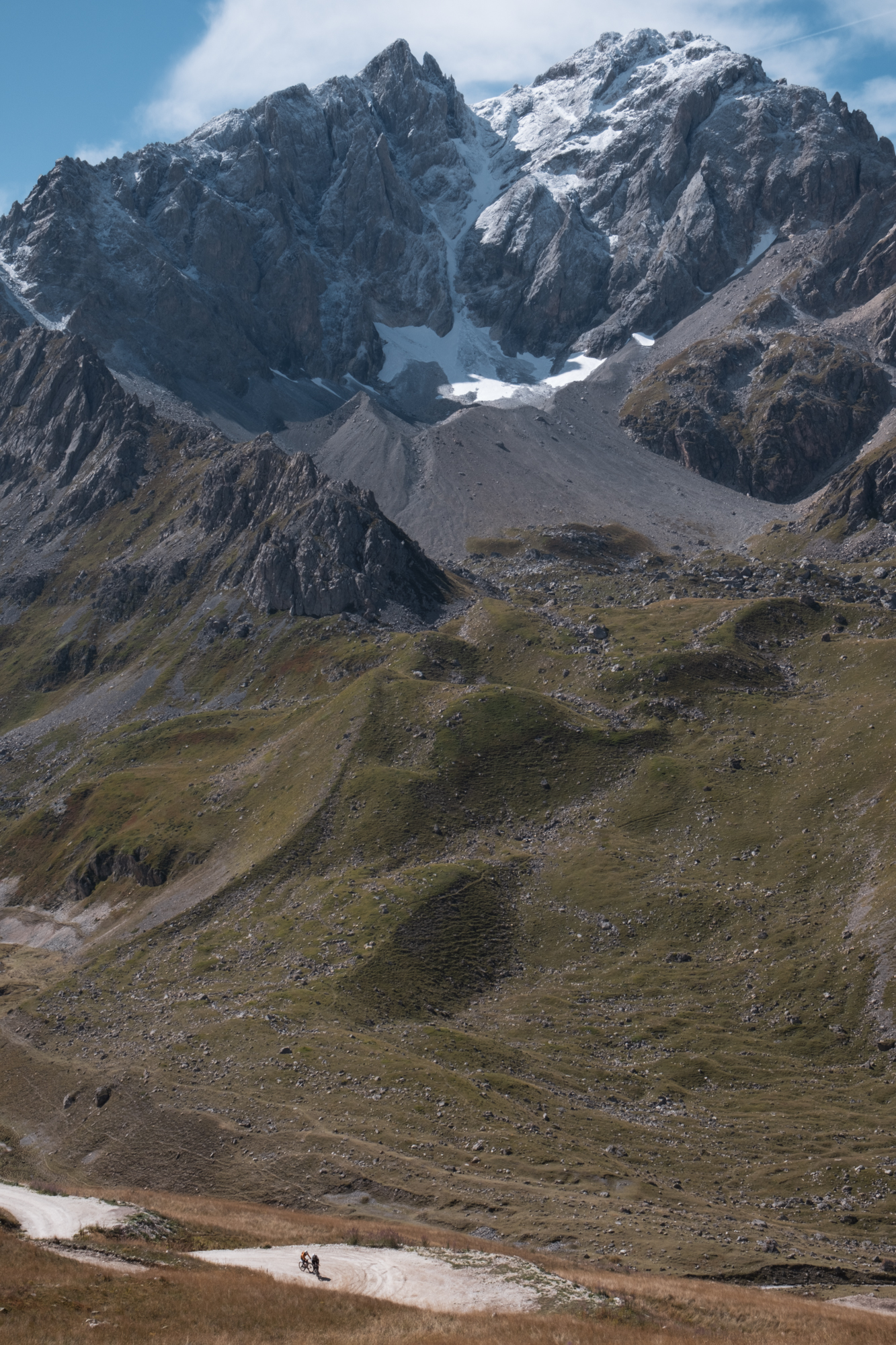 We were full of adrenaline at the top of the infamous mountain. It was all for us as no cars could access the road to the top, and at that moment no other cyclists were challenging the adverse weather. Our Hammerhead was displaying an air temperature of -4°C, and we could barely stay upright given the strong gusts of wind. The descent to Plan Lachat was short but extremely cold, so the off-road climb into the Haute Vallée de la Clarée was helpful to warm up again.
