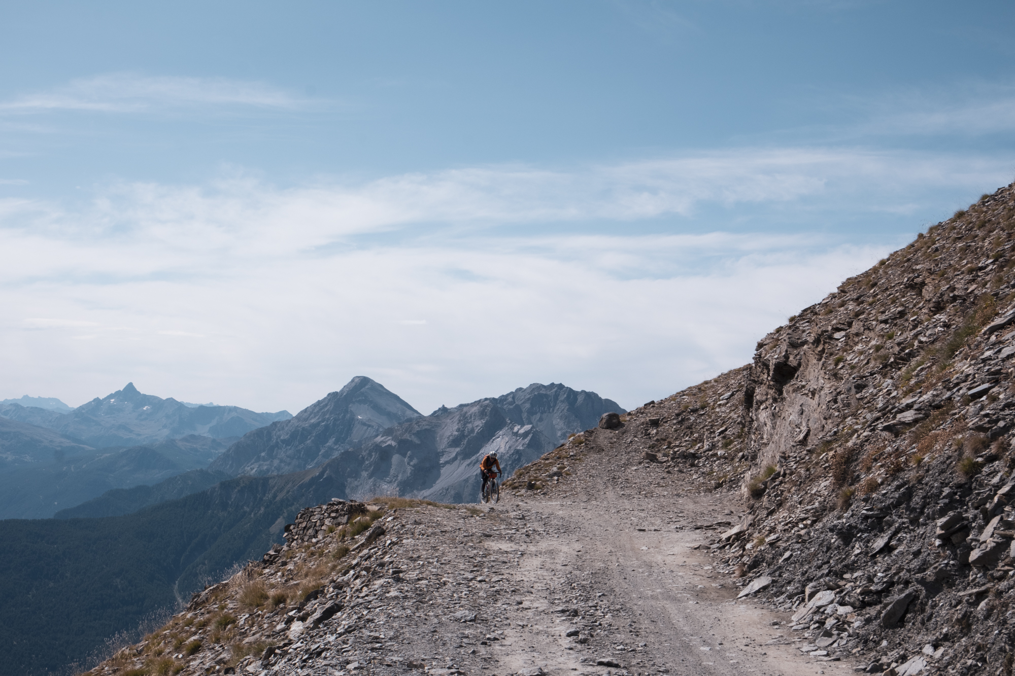 Before reaching Strada dell’Assieta, a technical and rocky descent was followed by a long climb, which was paved up to Sestriere and then off-road until the 2.400 meters elevation mark. Multiple slices of pizza ingested in the ski resort gave us the energy needed to reach the top, and we also made sure we carried enough extra food and water, as for the next 40 kilometers we would be riding on a plateau at over 2.000 meters, isolated from civilization.