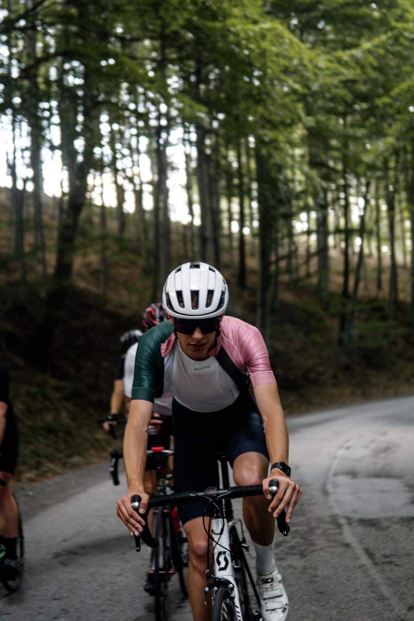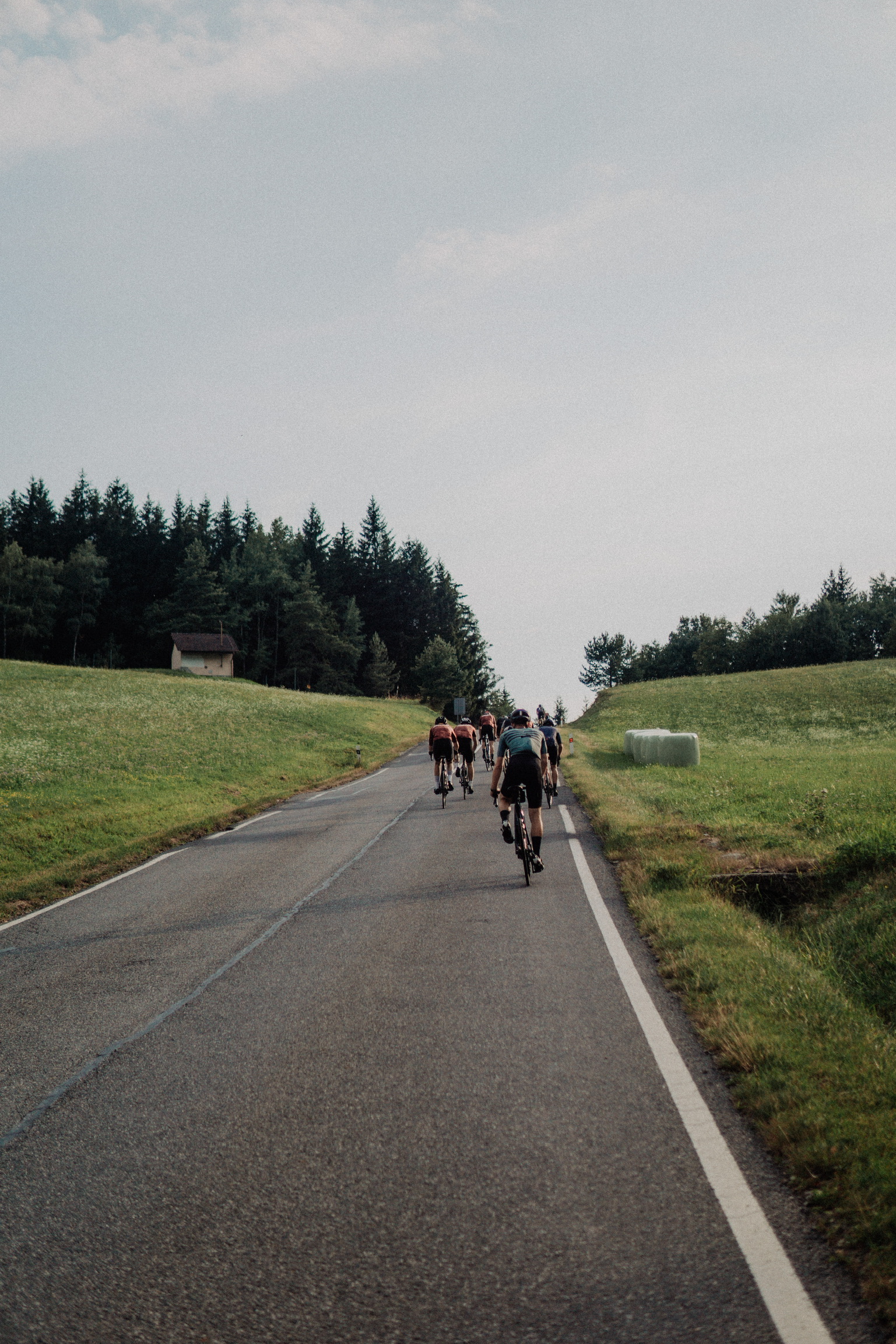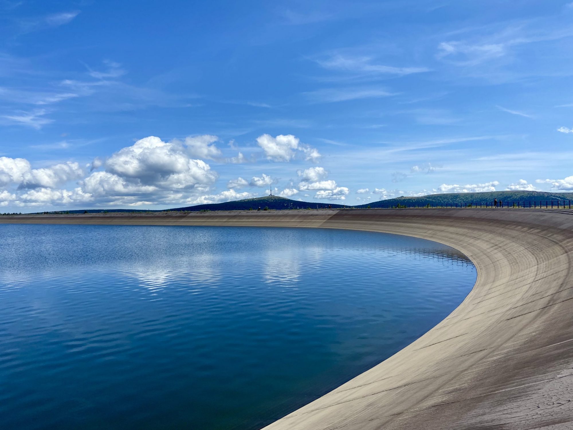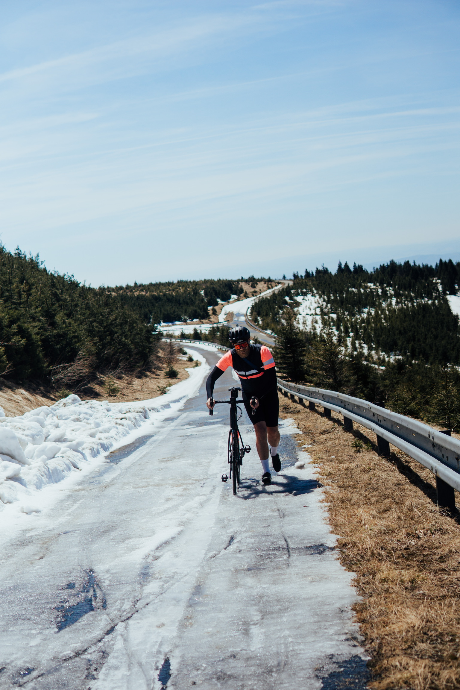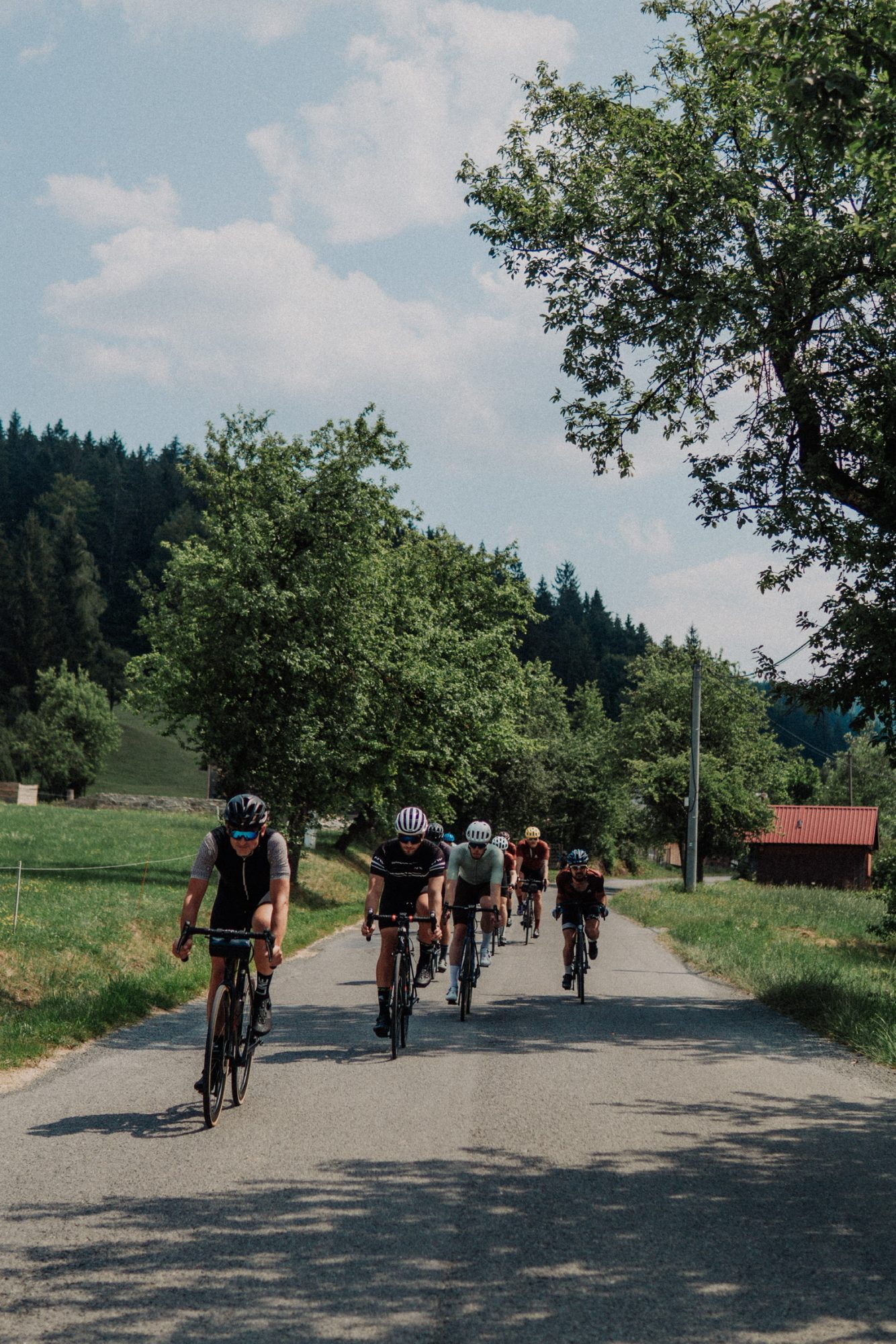 There are 3 main climbs on the route: Dlouhe Strane, the favorite choice of several Sazka Tour editions, Cervenohorske Sedlo, and Praded Mountain. Dlouhe Strane is a steady climb on a quiet road with a couple of steep sections. What makes this hill truly special though is for sure its peak: it is a huge water reservoir serving as a pumped storage hydro power plant. With its oval shape and inward incline, it might resemble a giant velodrome. From there you can already spot the tower on the nearby peak of Praded Mountain, our last climb of the day, but first we have to get over other hills.