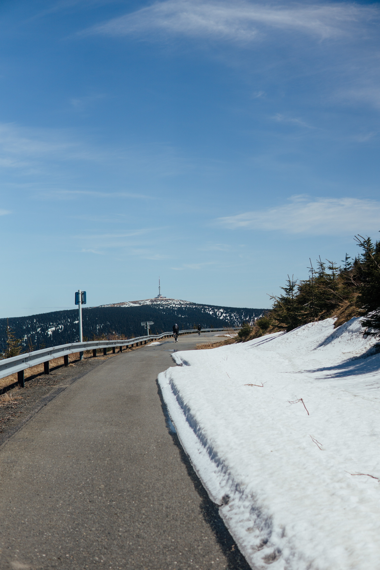 Two intermediate climbs via narrow winding forest road follow before we get to the foot of the last climb: Praded Mountain, the highest peak of Moravia. Its altitude of 1.492 m might not sound overly bold, but with the previous climbs already in the legs, it is still 600 m of elevation to gain. On the other hand, it is quite a steady climb so do not get discouraged. The first two thirds of the climb go through the woods, until the scenery finally opens, with the view of the iconic tower at the top.